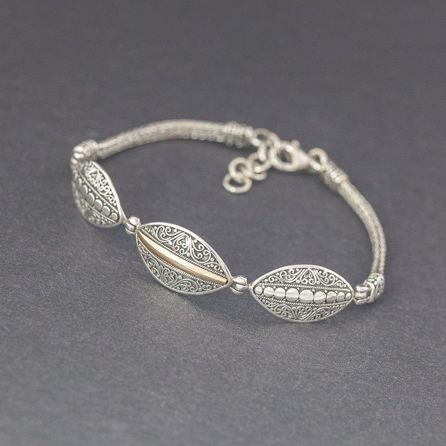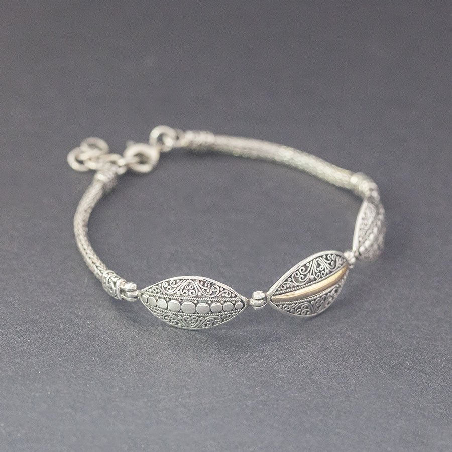 Ekskluzywna bransoletka wykonana ze srebra próby 925 i 18-karatowego złota z pięknie zdobioną powierzchnią. Zdobienia zostały wykonane ręcznie pracochłonną techniką granulacji. Łańcuszek również został upleciony ręcznie. Grubość łańcuszka 3 mm. Wielkość ozdobnych elementów bransoletki 12x22 mm i 11x21 mm. Długość bransoletki 18,5 cm + 2 cm łańcuszka wydłużającego.
