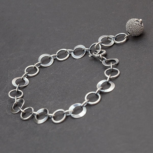 Bransoletka wykonana ze srebra próby 925 (wielkość ogniwek w łańcuszku - 9mm, 10mm). Na końcu łańcucha zawiesiłam ozdobną kuleczkę bali (10mm). Bransoletka jest regulowana, jej całkowita długość to 21 cm. Bransoletka jest ozdobnie zapakowana.