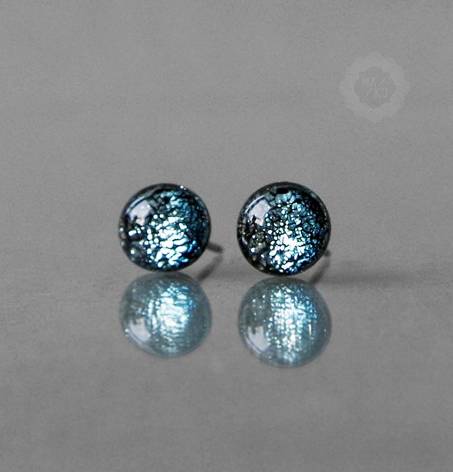 Szklane kolczyki- sztyfty wykonane, z niezwykłego,pięknie mieniącego się szkła, metodą fusingu. Kolor kolczyków zmienia się,zależnie od kąta patrzenia.