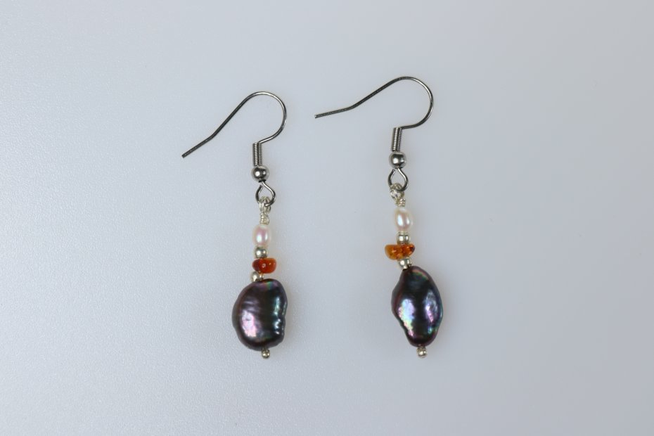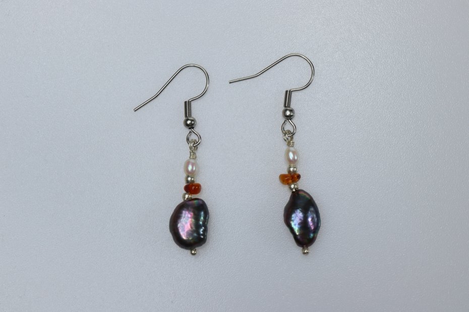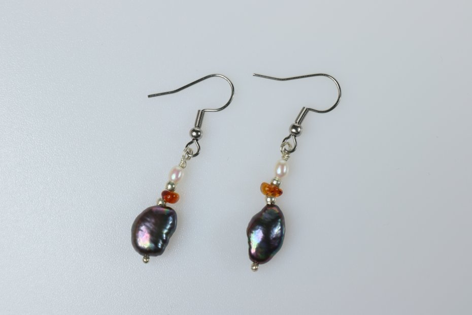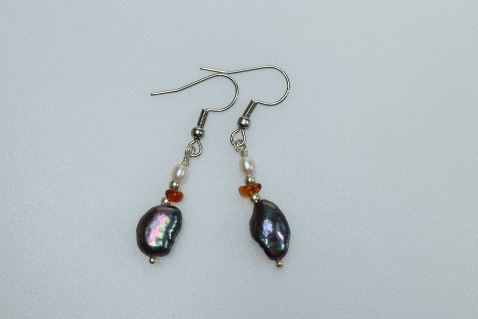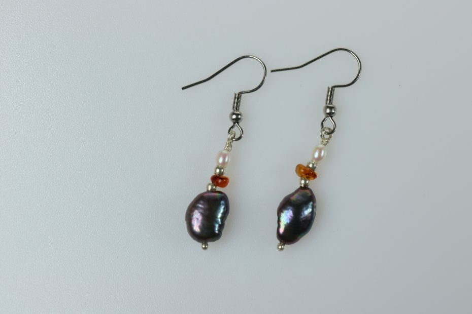 Srebrne kolczyki z bursztynem i perłami. Długość z biglem 4,5 cm. Kolczyki są bardzo lekkie (waga pary 4 g).