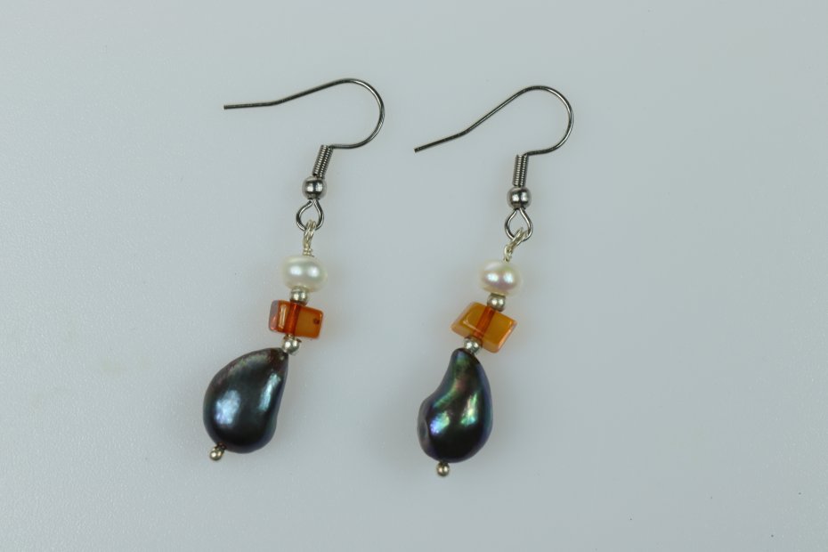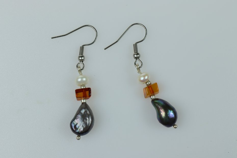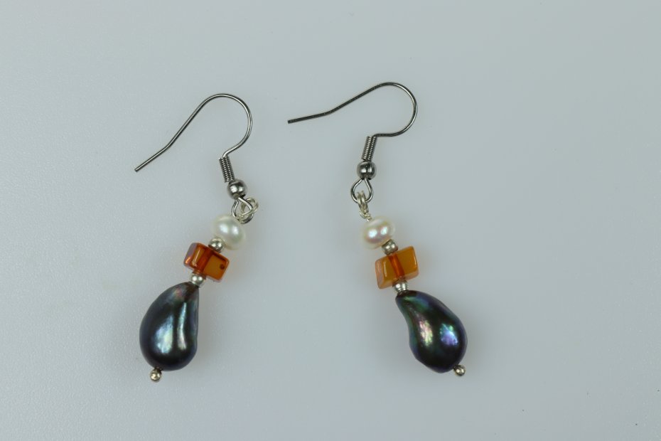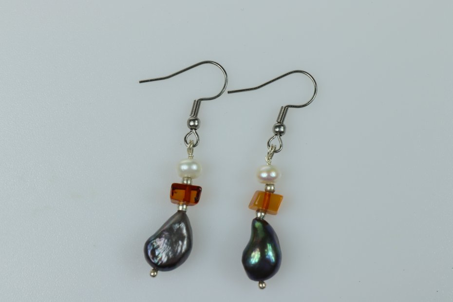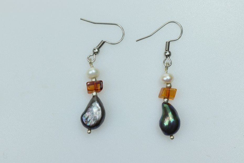 Srebrne kolczyki z bursztynem i perłami. Długość z biglem 5 cm. Kolczyki są bardzo lekkie (waga pary 4 g).