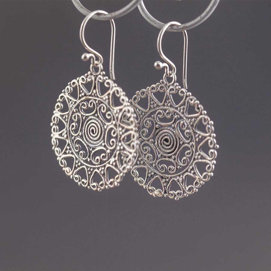 Wyjątkowe kolczyki od podstaw wykonane ręcznie, pracochłonną techniką granulacji ze srebra próby 925. Wielkość ozdobnej tarczy kolczyka 28 mm. Długość całkowita kolczyków 4,4 cm.