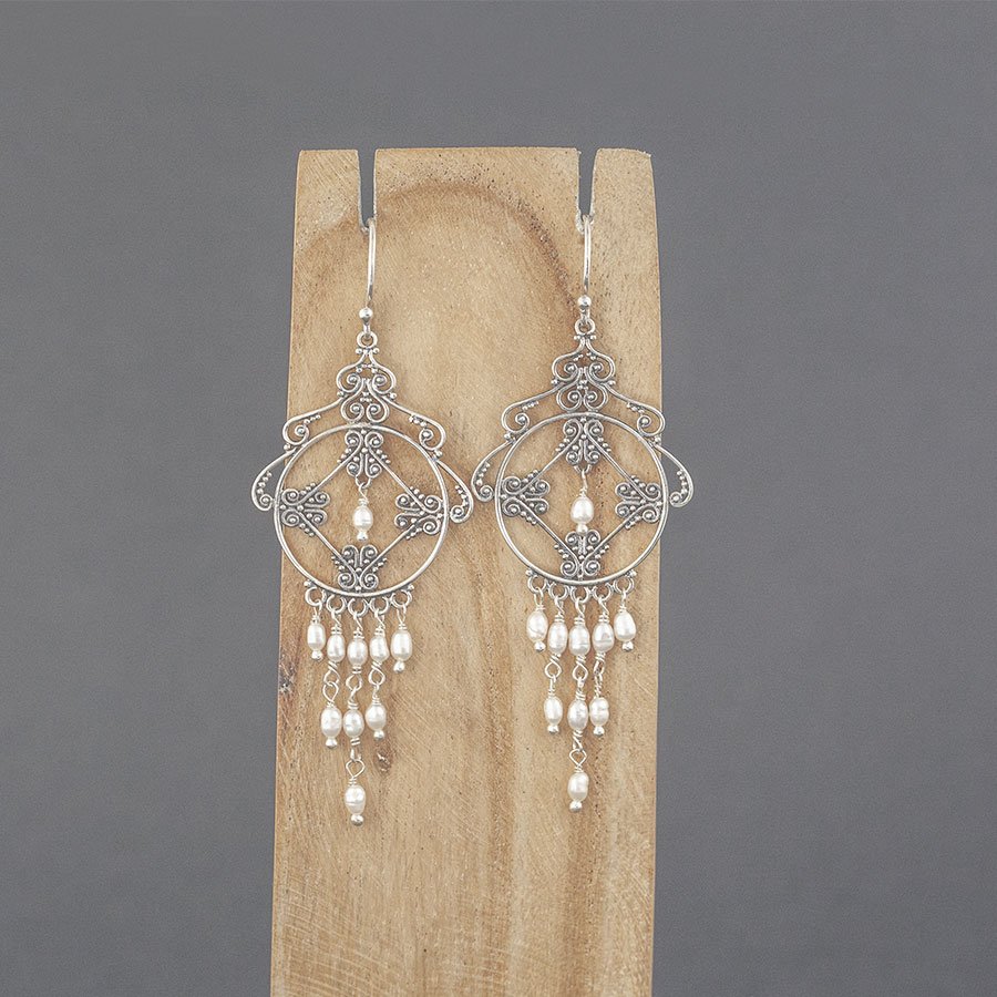 Kolczyki w stylu orientalnym od podstaw wykonane zostały ręcznie ze srebra próby 925 oraz białych perełek wielkości 4x3 mm. Wielkość ozdobnej tarczy kolczyka 28x30 mm. Długość całkowita kolczyków 7,4 cm.