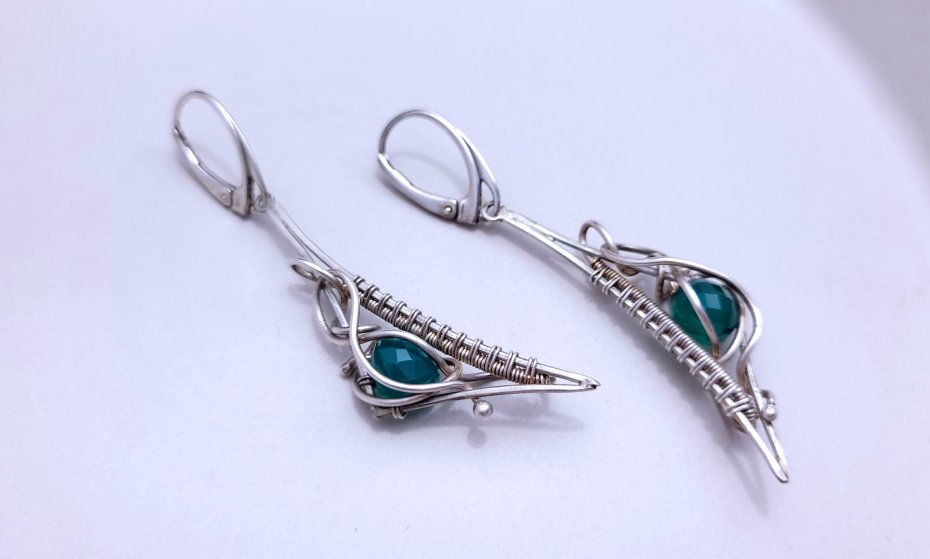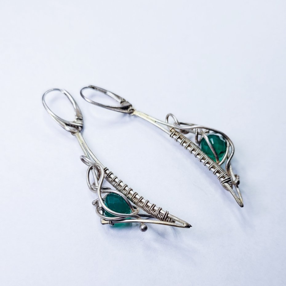 Ręcznie robione srebrne kolczyki w technice wire wrapping z zielonym kamieniem. Wyjątkowa, artystyczna biżuteria dla miłośniczek unikatów.
