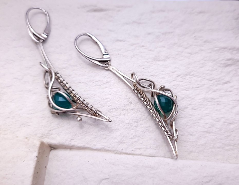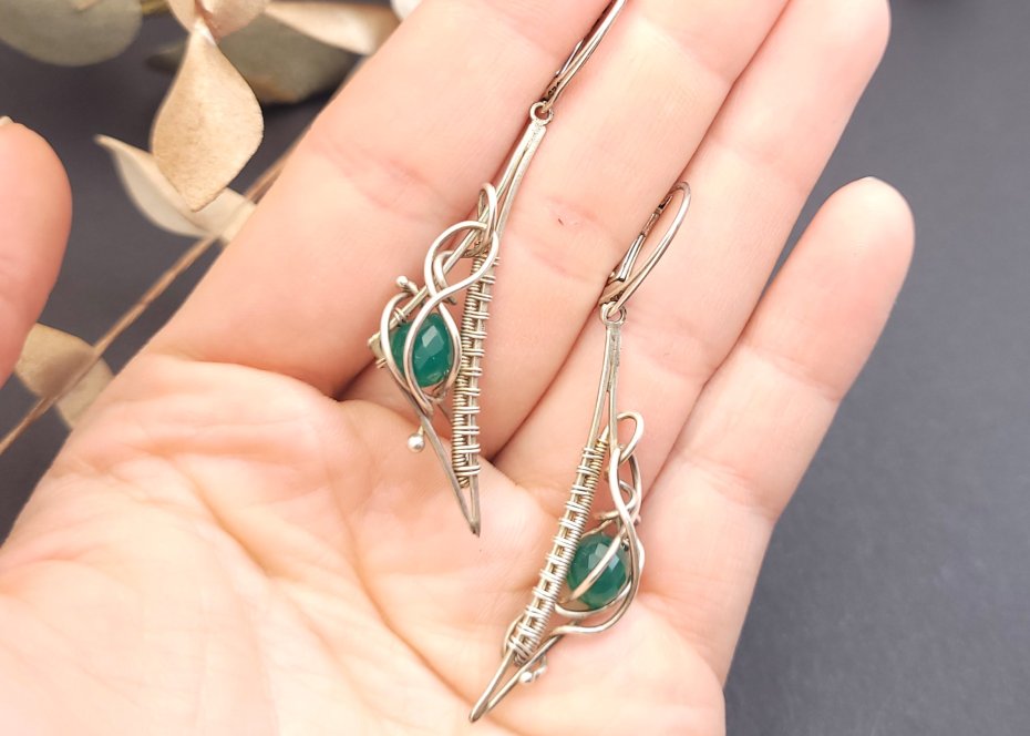 Te wyjątkowe srebrne kolczyki zostały wykonane ręcznie w pracowni jubilerskiej z użyciem kunsztownej techniki wire wrapping – precyzyjnego oplatania drutem, tworzącego dekoracyjne i trwałe formy. W centralnej części umieszczony został zielony kamień naturalny (np. agat/onyks – można doprecyzować), który pięknie kontrastuje ze srebrną oprawą, dodając elegancji i głębi kolorystycznej.