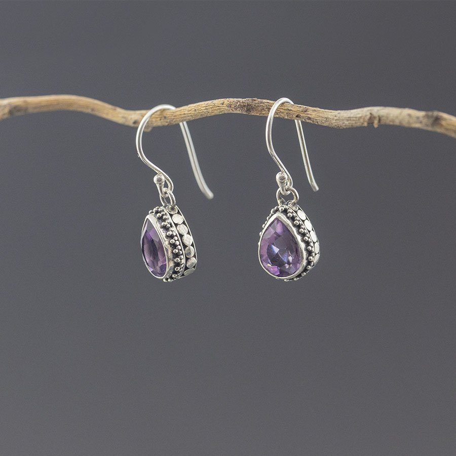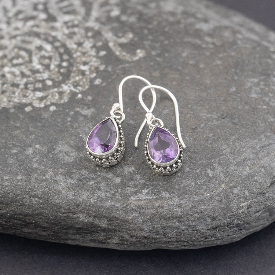 Kolczyki wykonane ze srebra próby 925 z oprawionymi kamieniami ametystu (7x10 mm). Wielkość tarcz kolczyków 9x12 mm. Długość całkowita kolczyków 2,7 cm. Bok kolczyków ozdobiony został ręcznie wykonanym ornamentem.