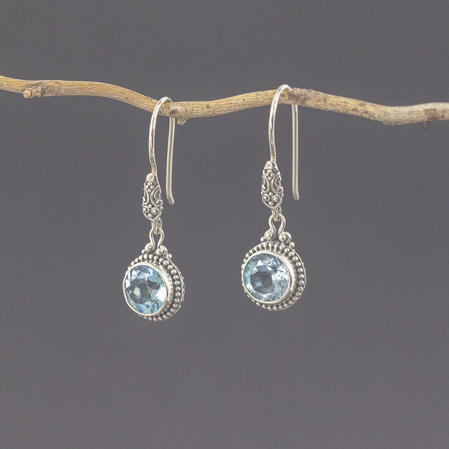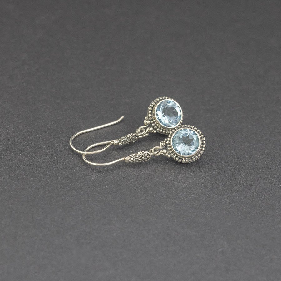 Eleganckie kolczyki, których podstawę stanowią kamienie niezwykłej błękitnego topazu (8 mm) oprawione w srebro próby 925. Kolczyki ozdobione są ręcznie wykonanym ornamentem. Bigle również zostały wykonane i ozdobione ręcznie. Na uwagę zasługuje ażurowe zdobienie z tyłu kolczyka. Wielkość tarczy kolczyka 10 mm. Długość całkowita kolczyków 3,6 cm.