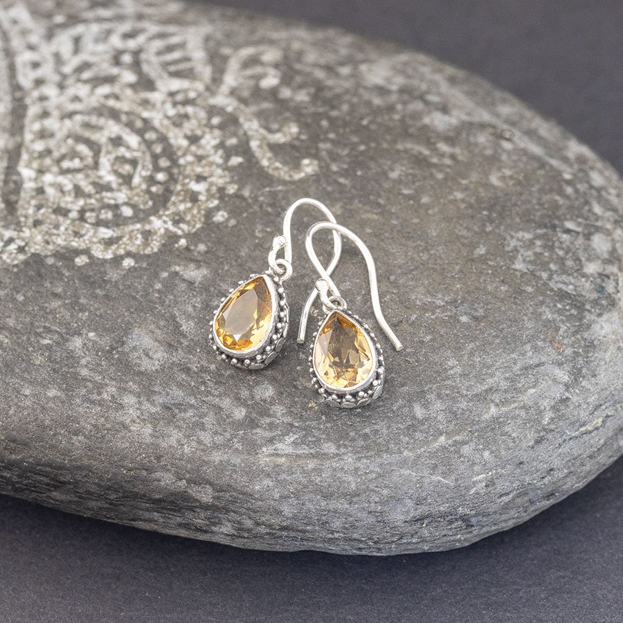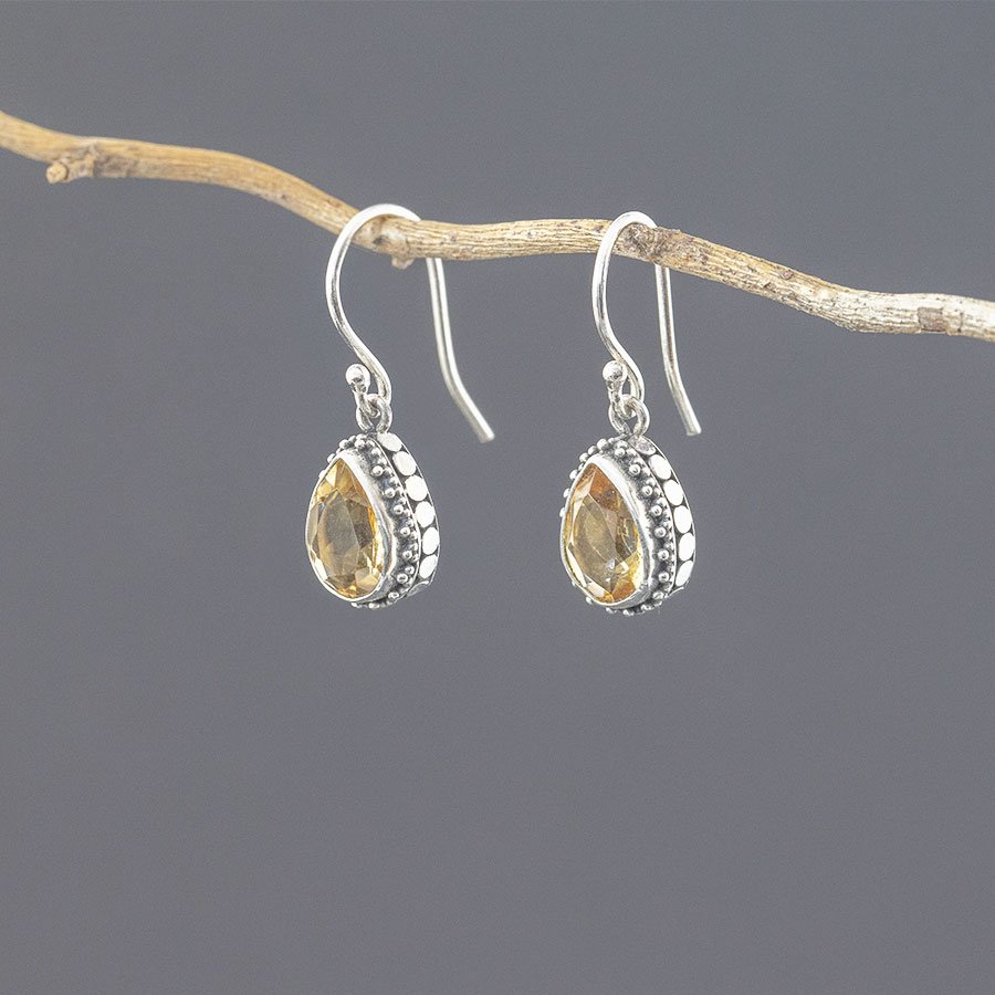 Kolczyki wykonane ze srebra próby 925 z oprawionymi kamieniami cytrynu (7x10 mm). Wielkość tarcz kolczyków 9x12 mm. Długość całkowita kolczyków 2,7 cm. Bok kolczyków ozdobiony został ręcznie wykonanym ornamentem.