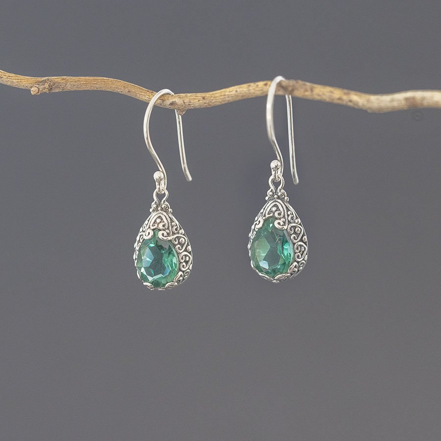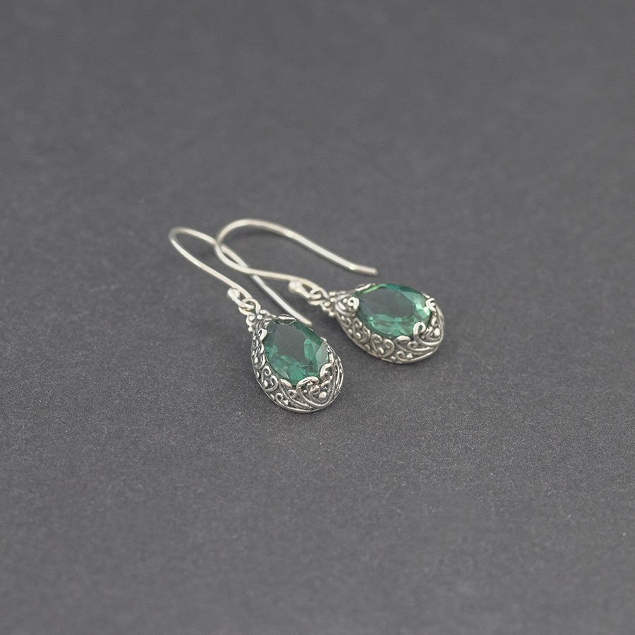 Eleganckie kolczyki, których podstawę stanowią kamienie kwarcu zielonego oprawione w srebro próby 925. Wielkość kamienia 7x9 mm. Wielkość tarczy kolczyka 10x15 mm. Kolczyki ozdobione są ręcznie wykonanym ornamentem. Długość całkowita kolczyków 3 cm.