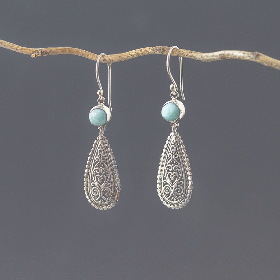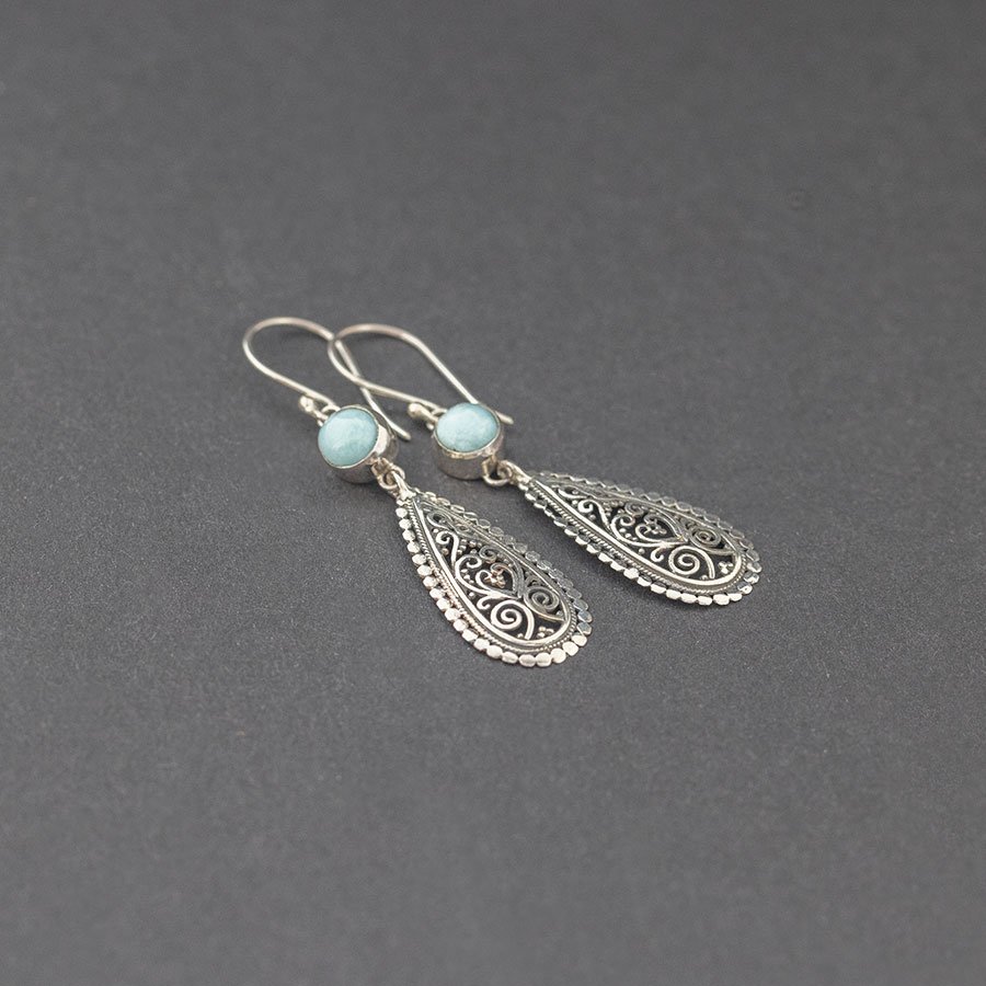 Kolczyki od podstaw wykonane zostały ręcznie ze srebra próby 925 z oprawionymi kamieniami larimaru. Wielkość kamieni 6 mm. Wielkość ażurowej tarczy kolczyka 12x23 mm. Długość całkowita kolczyków 5 cm.