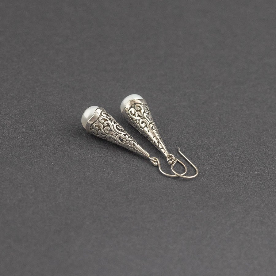 Eleganckie kolczyki od podstaw wykonane ręcznie ze srebra próby 925 oraz białych pereł słodkowodnych. Wielkość wystającej perełki 4x8 mm. Długość całkowita kolczyków 3,8 cm.