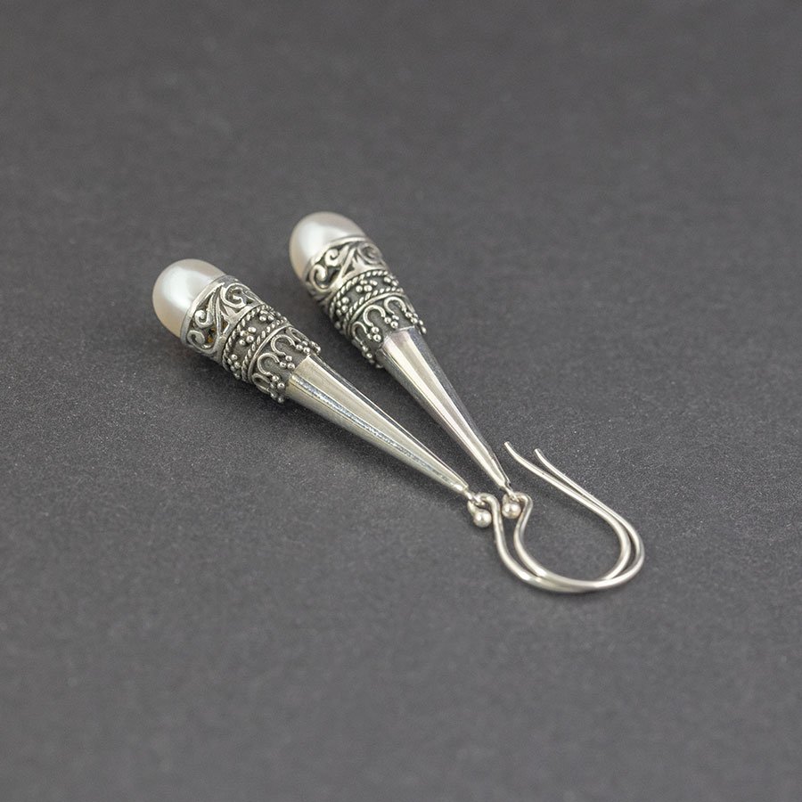 Eleganckie kolczyki z nutą orientu w całości wykonane ręcznie ze srebra próby 925 oraz białych pereł słodkowodnych (7x8 mm). Długość całkowita kolczyków 5,7 cm. Całość zdobień wykonana została ręcznie.