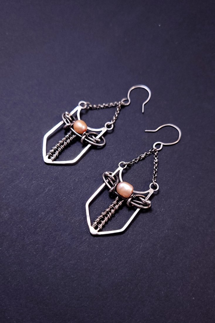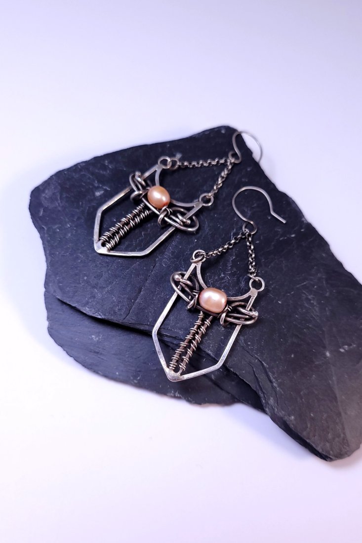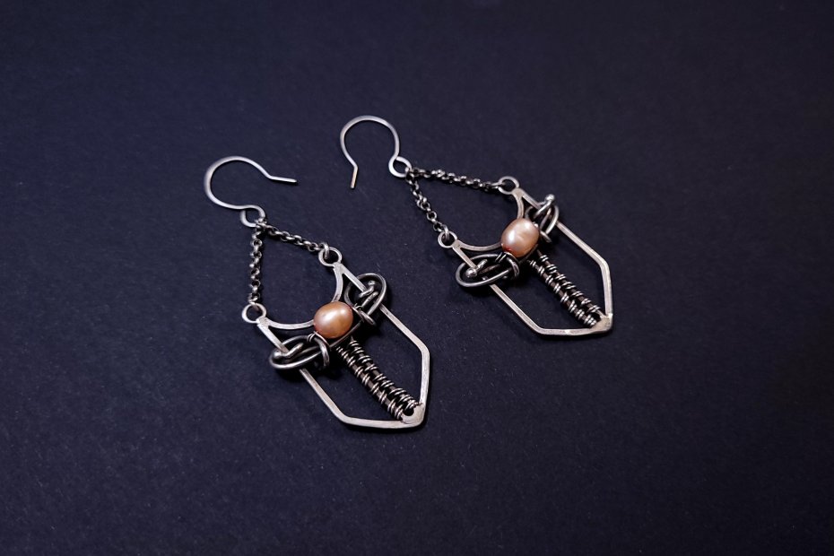 Te wyjątkowe kolczyki zostały wykonane ręcznie ze srebra próby 925. Centralnym punktem kompozycji jest subtelna naturalna perła o różowym odcieniu, dodająca całości delikatności i elegancji.