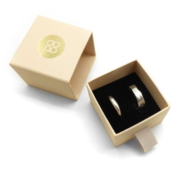 Powierzchnia obrączek jest wypolerowana. Szerokość: damska obrączka ma w najszerszym miejscu 3,5 mm a męska 7,5 mm, grubości wahają się między 2 a 2,5 mm. Możliwe jest wykonie grawerunku ręcznego lub laserowego wewnątrz obrączek. Wysyłane są w eleganckim pudełku zamkniętym w ekologicznym papierowym opakowaniu. Do produktu dołączony jest certyfikat. Proszę podać swoje rozmiary jubilerskie lub średnice wewnętrzne obrączek po złożeniu zamówienia.
