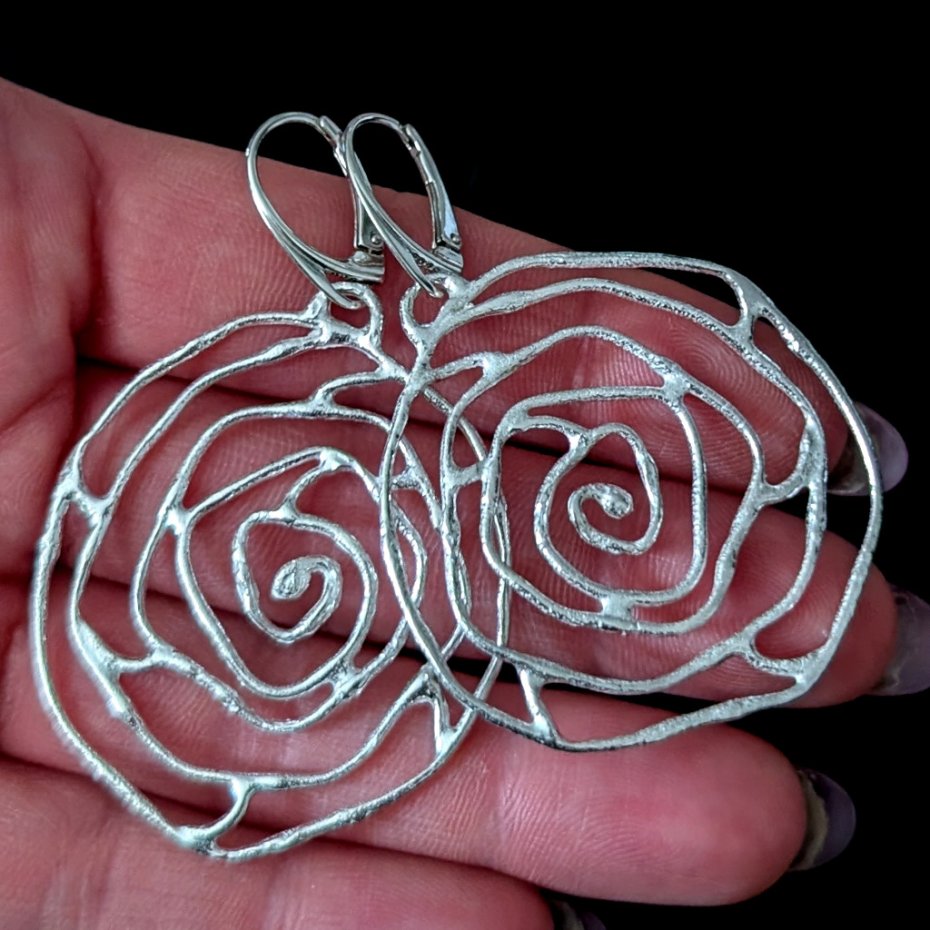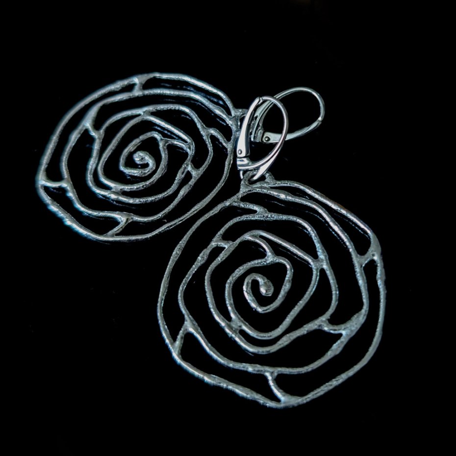 Oryginalne kolczyki wykonane ze srebra pr. 925. Możliwe również w wersji oksydowanej. Wymiary oprawy elementów 42 x 41 mm, długość z angielskimi biglami 58 mm. Waga 5,8 g jeden kolczyk. Kolczyki zapakowane w ozdobne pudełeczko.
