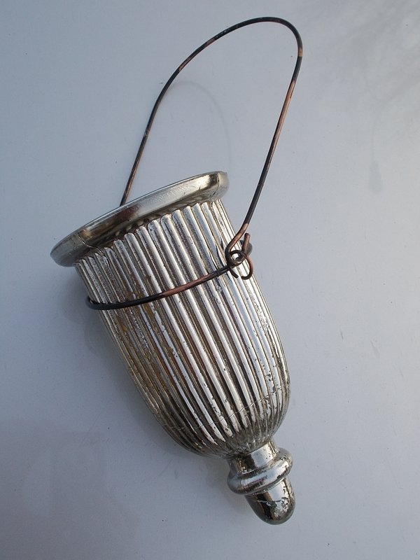 Duży lampion z grubego, ryflowanego szkła - postarzany na srebrzyście... oczywiście :) Doskonały na tealighta; praktyczny i klimatyczny. Zawieszka metalowa, ruchoma, zdejmowana. 9,5 x 17; z zawieszką 31 cm. Stan zachowania bardzo dobry.
