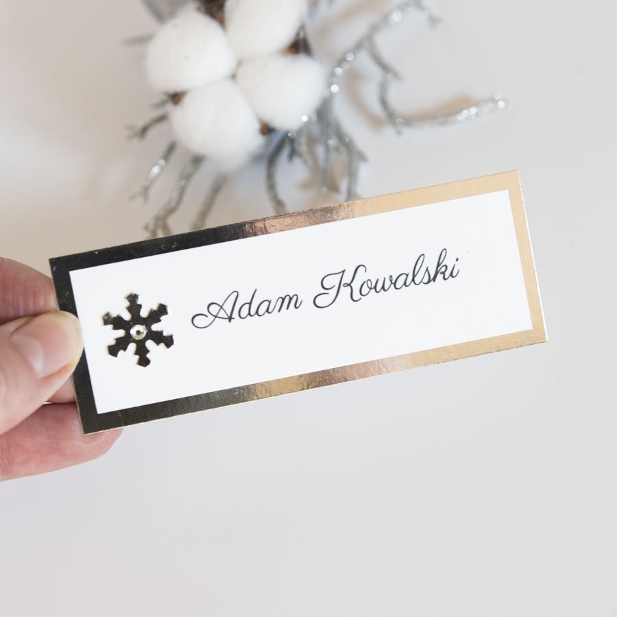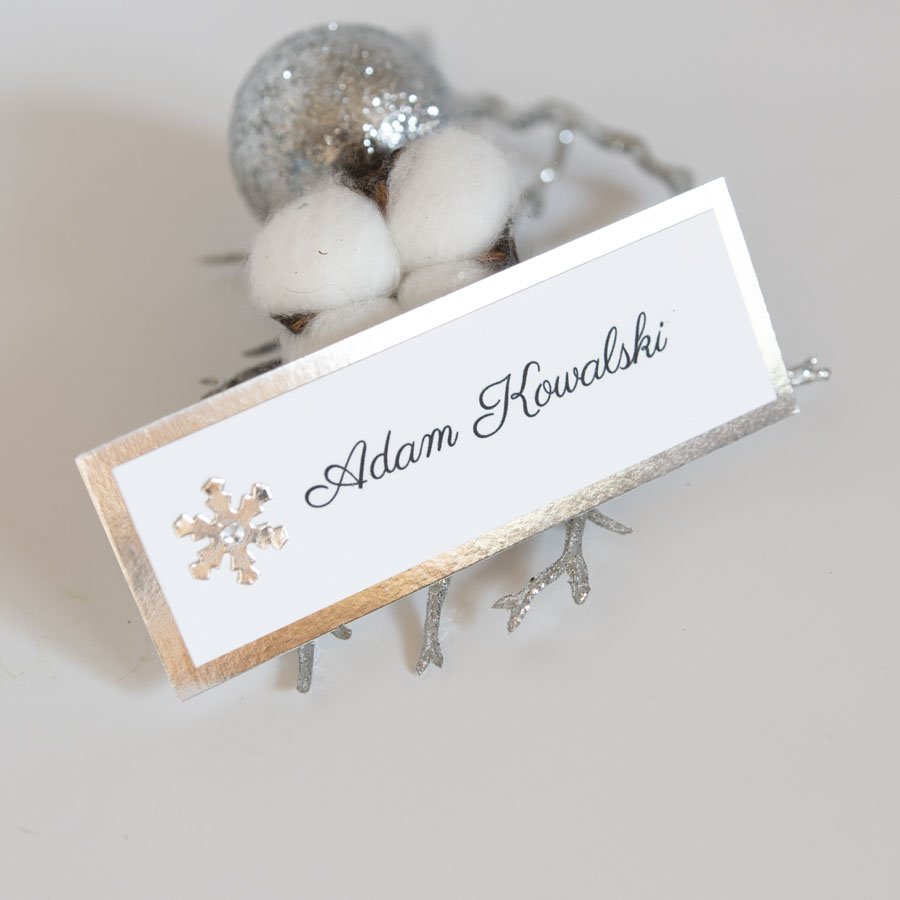 Winietki powstały z pięknego srebrnego kartonu, wydruk ozdobiony jest błyszczącą śnieżynką
