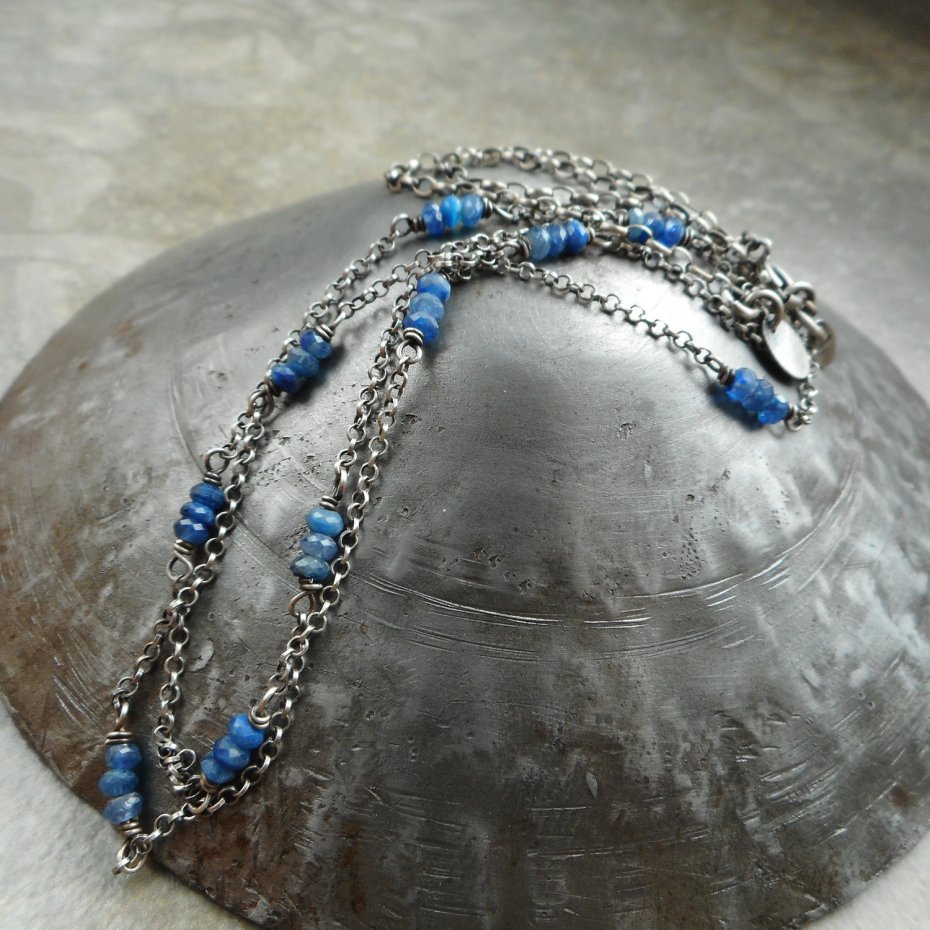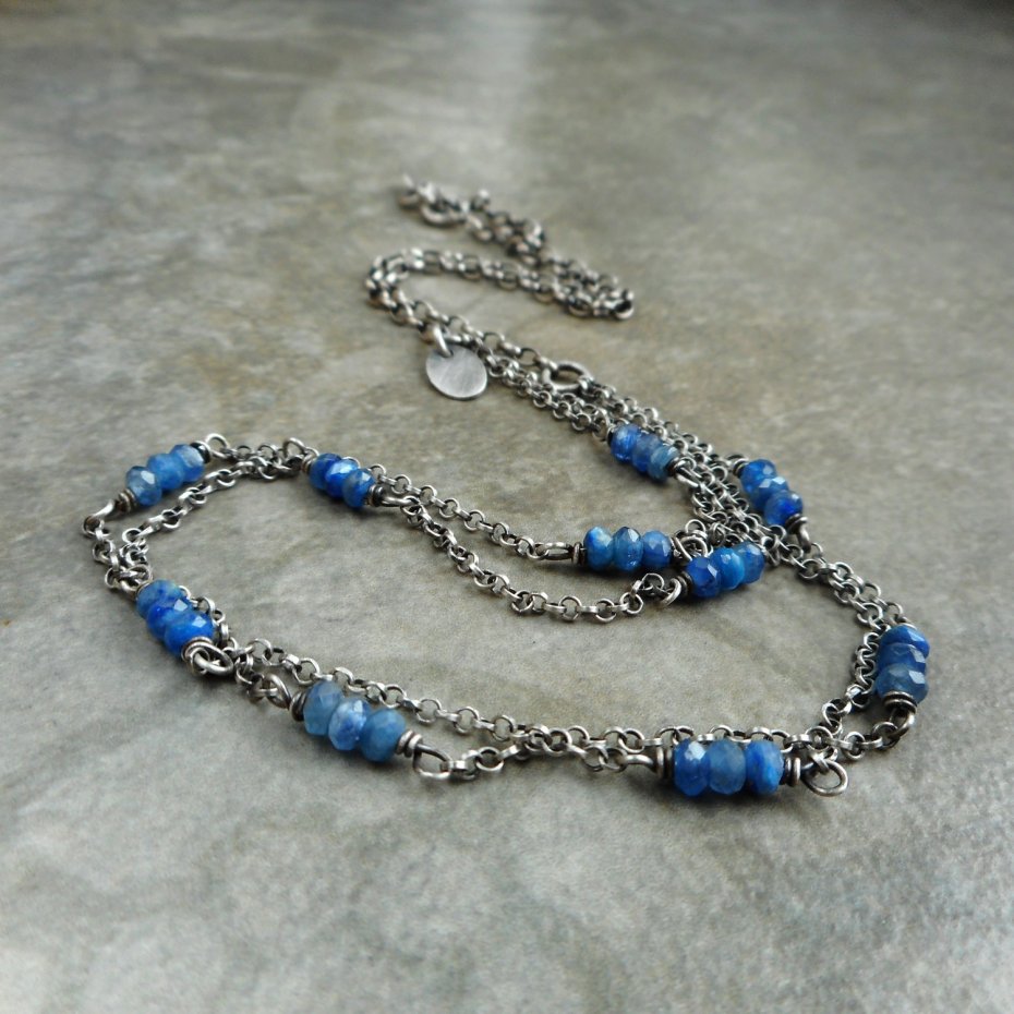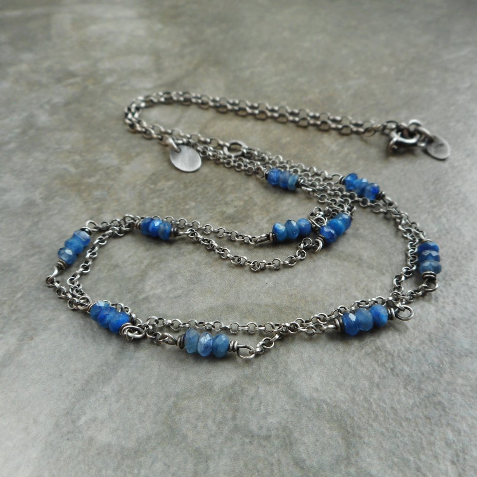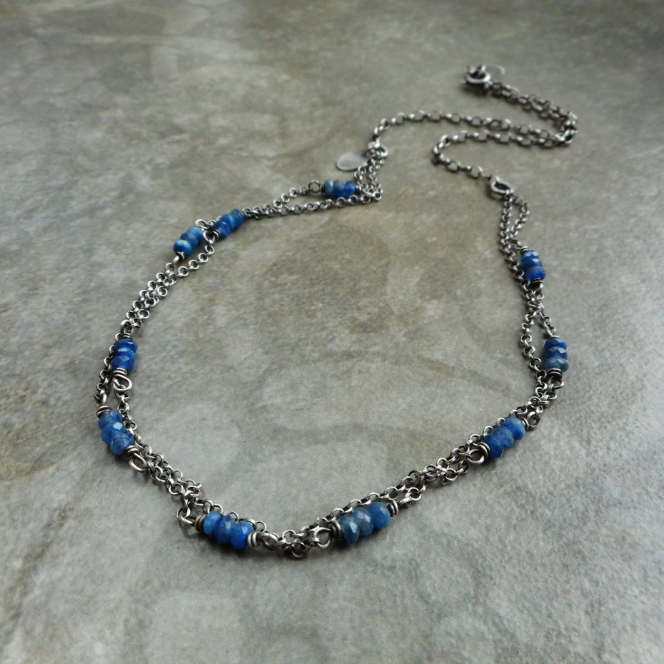 Delikatny naszyjnik wykonany ze szlachetnego srebra i kamieni naturalnych, gdzie połączenie połyskujących eleganckich kianitów i oksydowanego srebra nadaje biżuterii niepowtarzalnego charakteru.