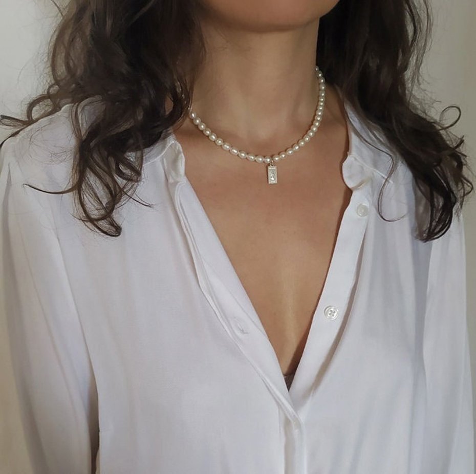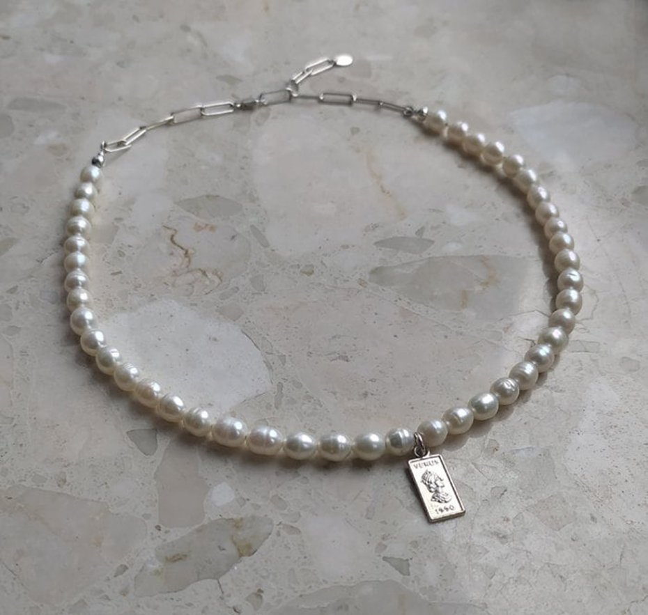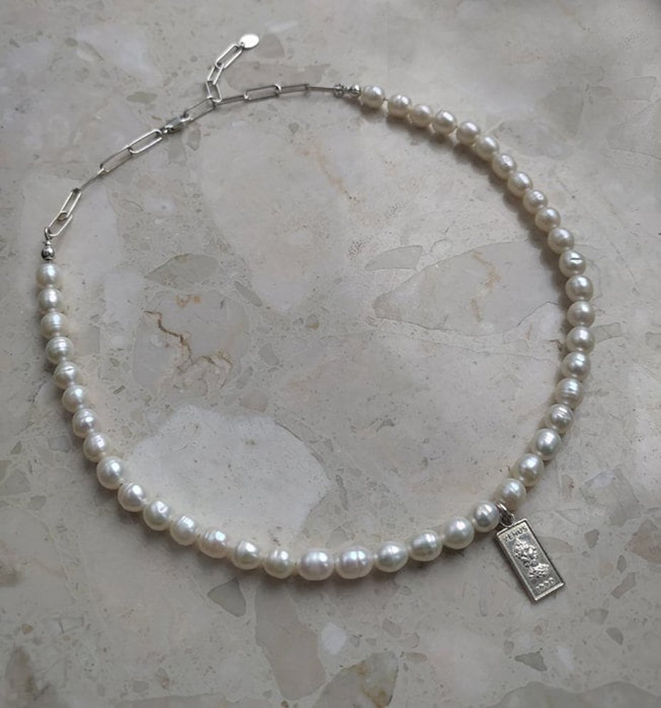 Naszyjnik wykonany jest ze srebra pr 925 i naturalnych prawdziwych pereł w kolorze białym.