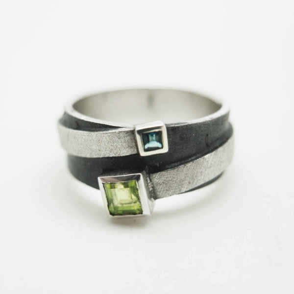 Pierścionek srebrny z oliwinem i topazem London. Częściowo patynowany na czarno wysoki na 1 cm pierścień ma oprawione dwa kwadratowe kamienie szlachetne: 2 mm niebieski topaz i 4 mm zielony oliwin. Intensywne odcienie błękitu i zieleni kamieni nadają życia pierścionkowi.