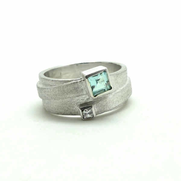 Pierścionek srebrny z topazem białym i niebieskim.Piaskowany szeroki na 1 cm pierścień ma oprawione dwa kwadratowe topazy: 2 mm bezbarwny i 4 mm niebieski. Delikatne odcienie błękitu i bieli tworzą lekką kompozycję.