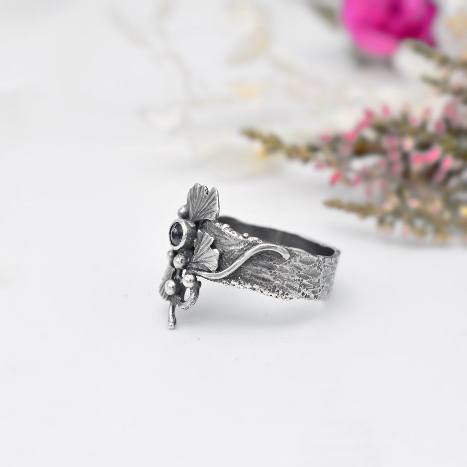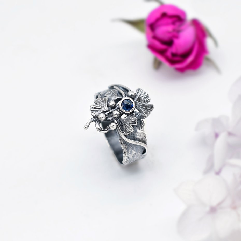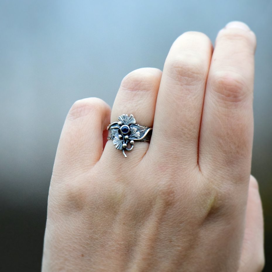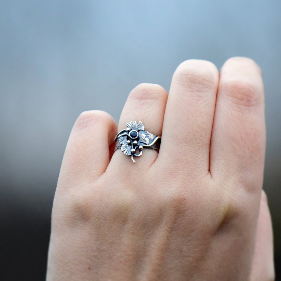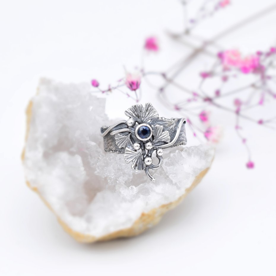 Wyjątkowy, inspirowany naturą pierścionek o lekko surowym charakterze, łączący artystyczny wyraz ze szlachetnością materiału. Wykonany ze srebra, zdobiony liśćmi miłorzębu, które otulają niewielki, ciemnoniebieski szafir wprowadzający do kompozycji elegancję i subtelny blask.
