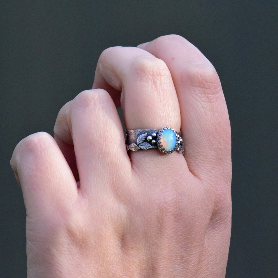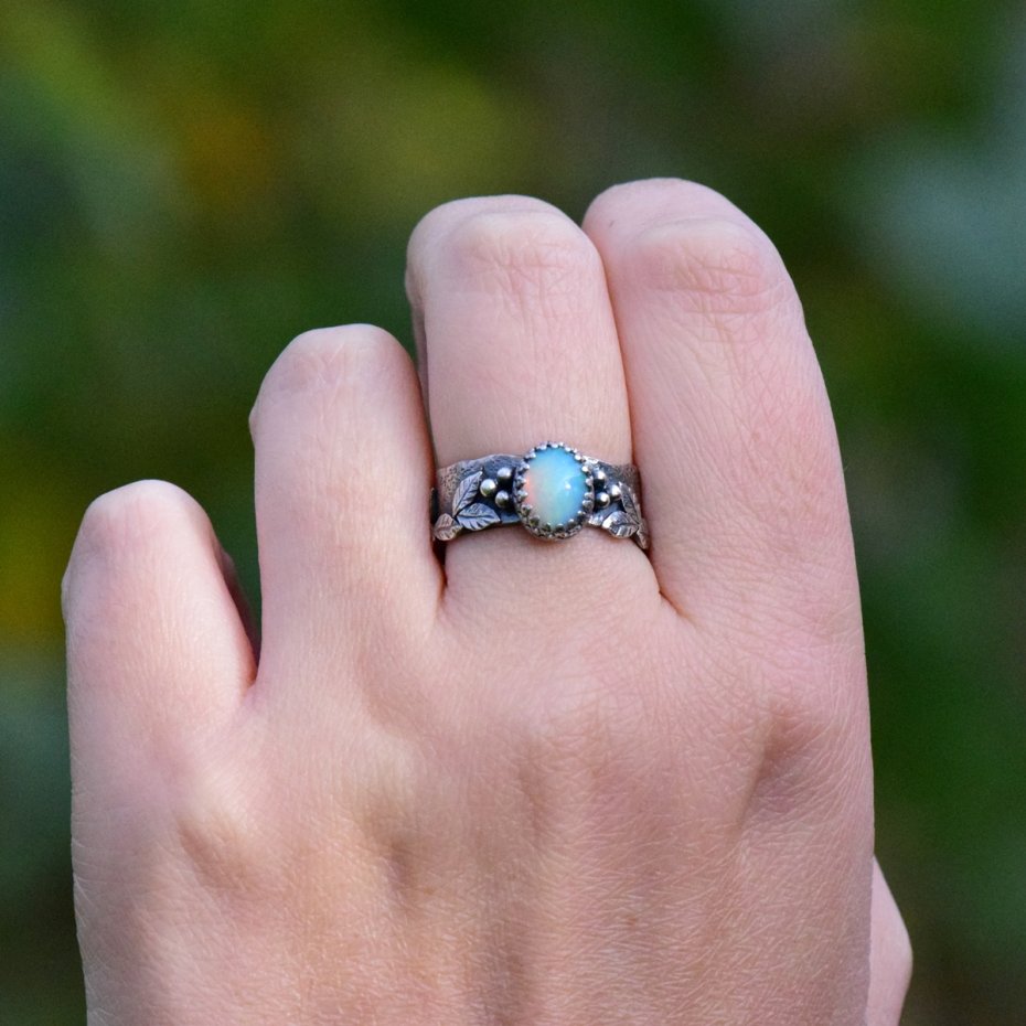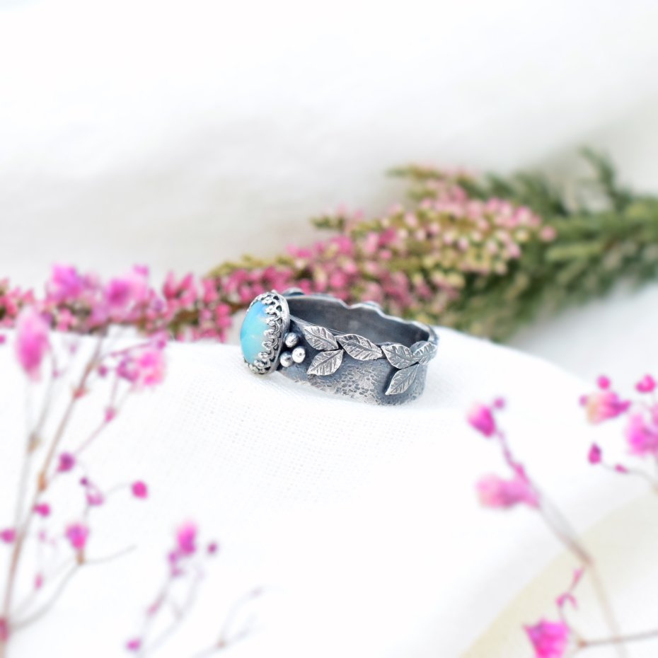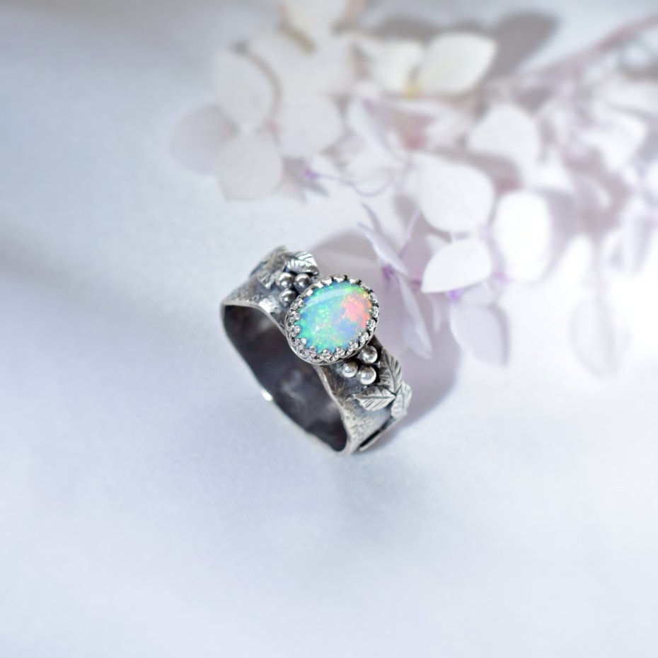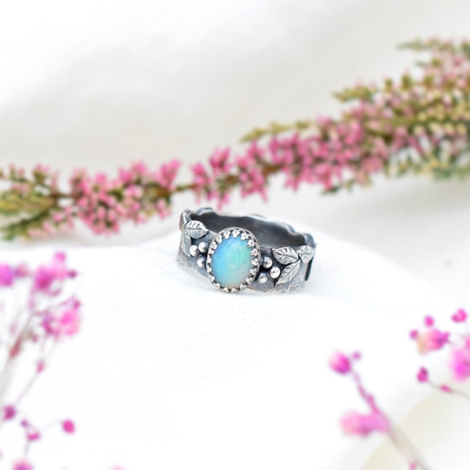 Tagi: #duży pierścionek z opalem, #opal etiopski, #pierścionek artystyczny, #pierścionek z listkami