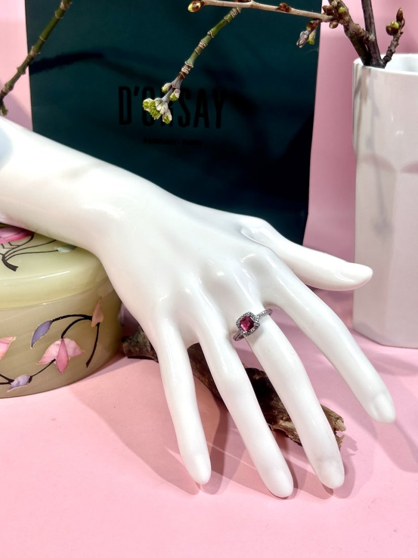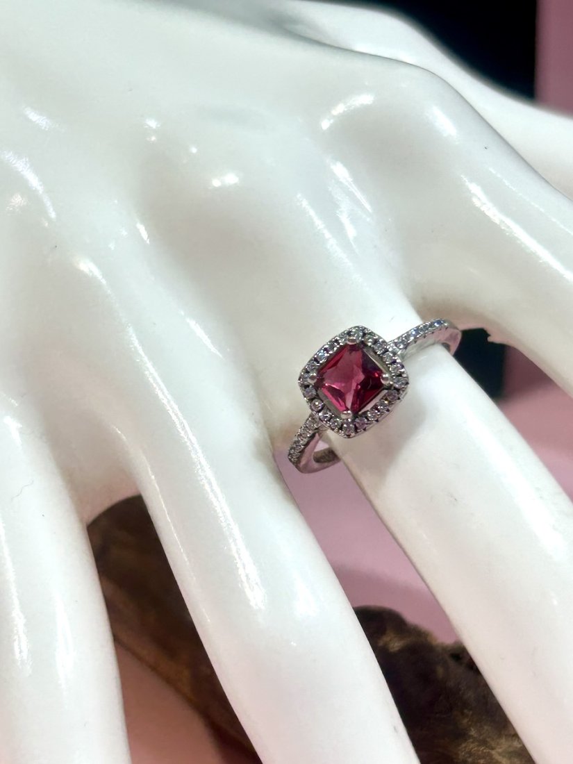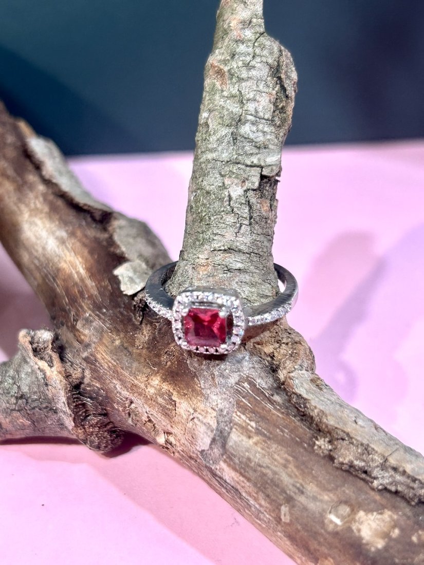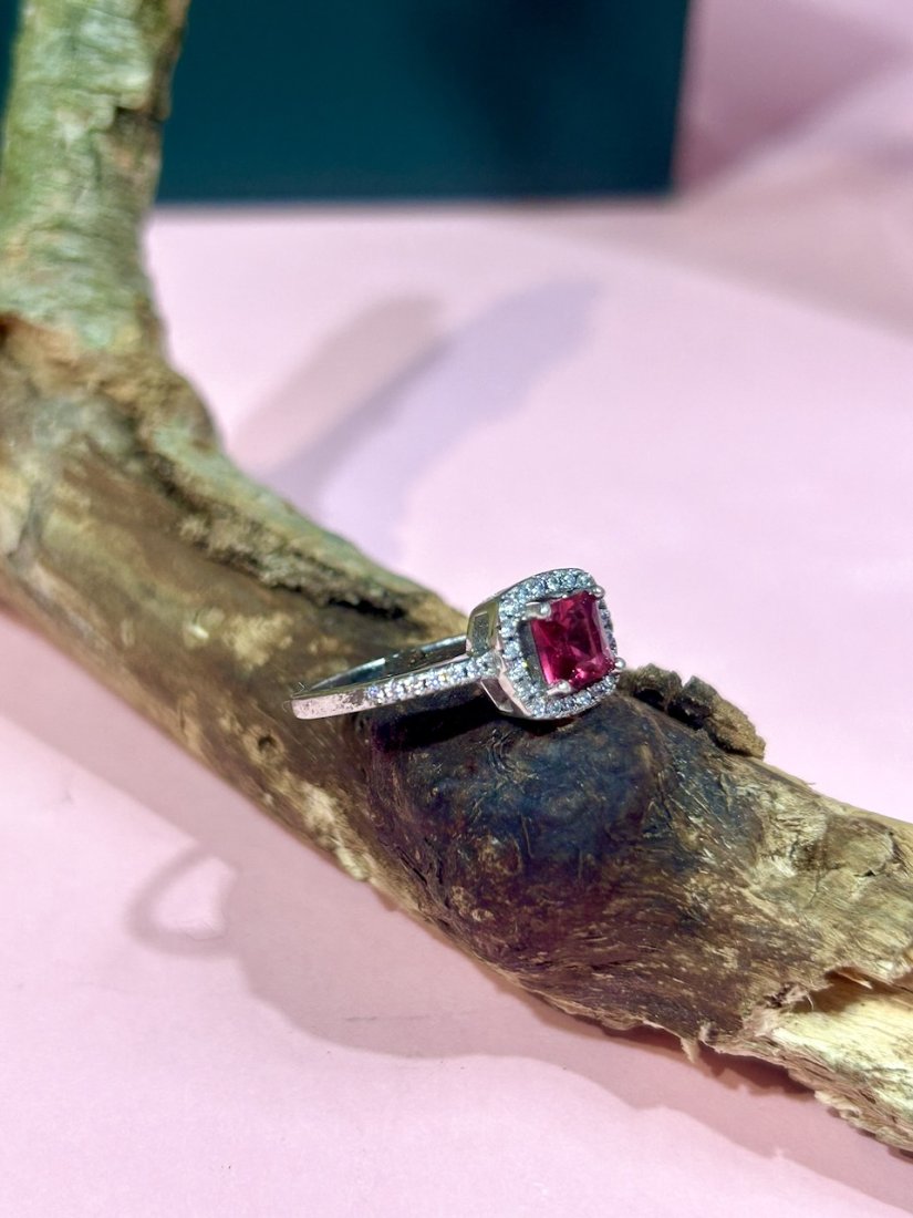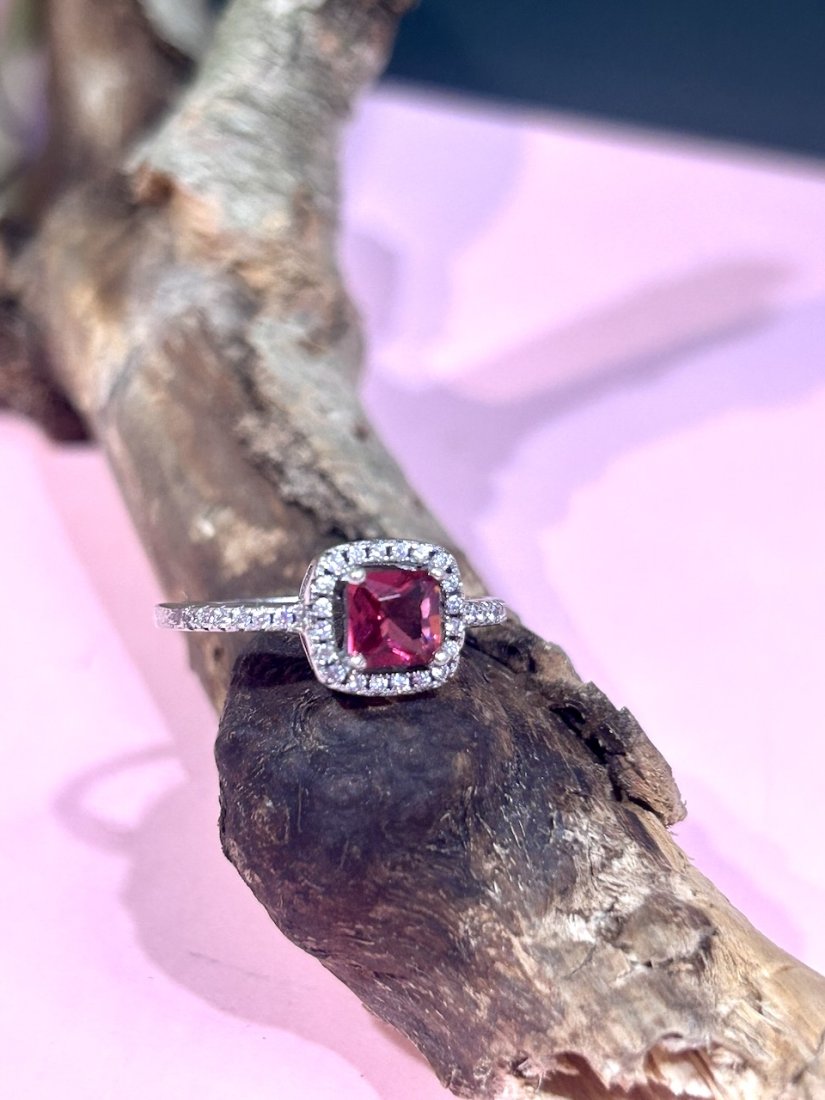 Centralnie oprawiony śliczny turmalin rubinowy w szlifie cushion. Dookoła halo z mikrocyrkonii.