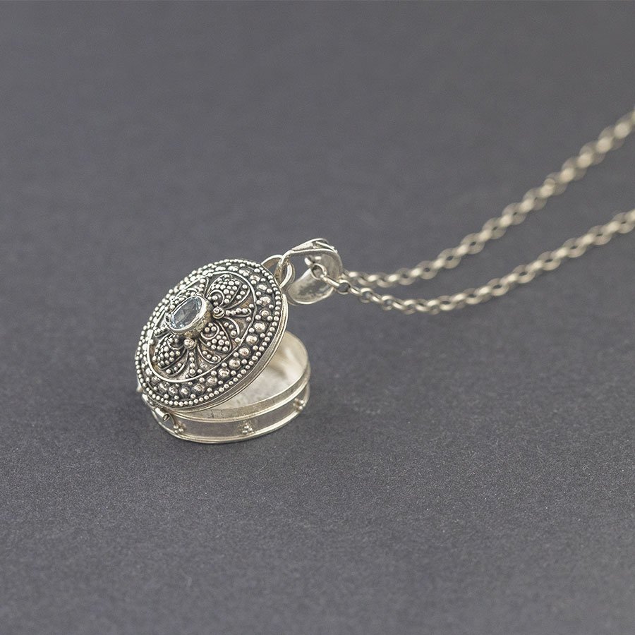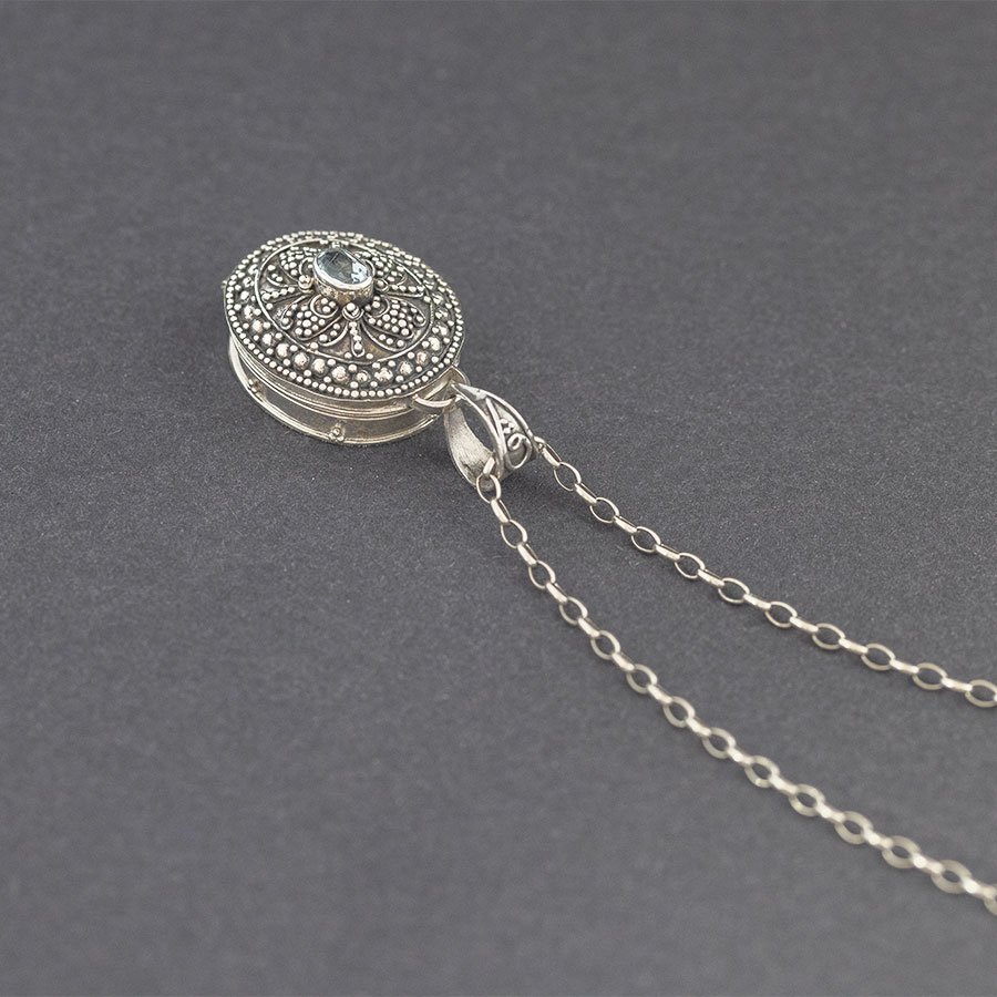 Srebrny wisior w formie sekretnika, wykonany ręcznie, z misternie zdobioną powierzchnią i oprawionym kamieniem topazu (4x6 mm). Sekretnik jest otwierany, do środka można włożyć zdjęcie lub bliski nam przedmiot. Elementy wykończeniowe wykonane z oksydowanego srebra próby 925. Wielkość sekretnika 2,4x2 cm. Długość całkowita wisiora 3,6 cm. Doskonały na prezent dla bliskiej osoby.