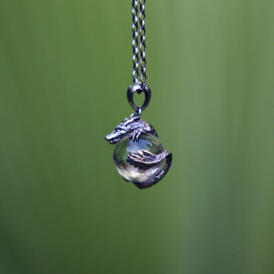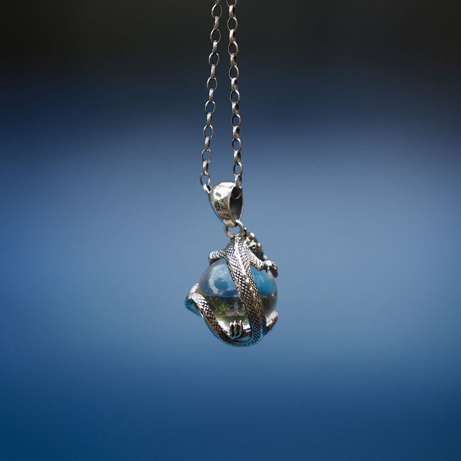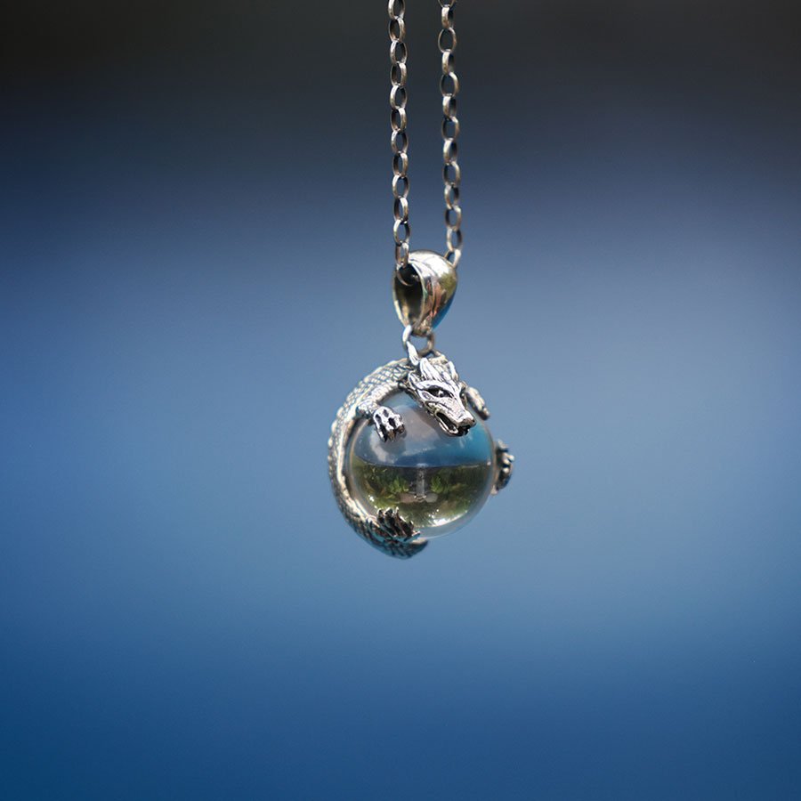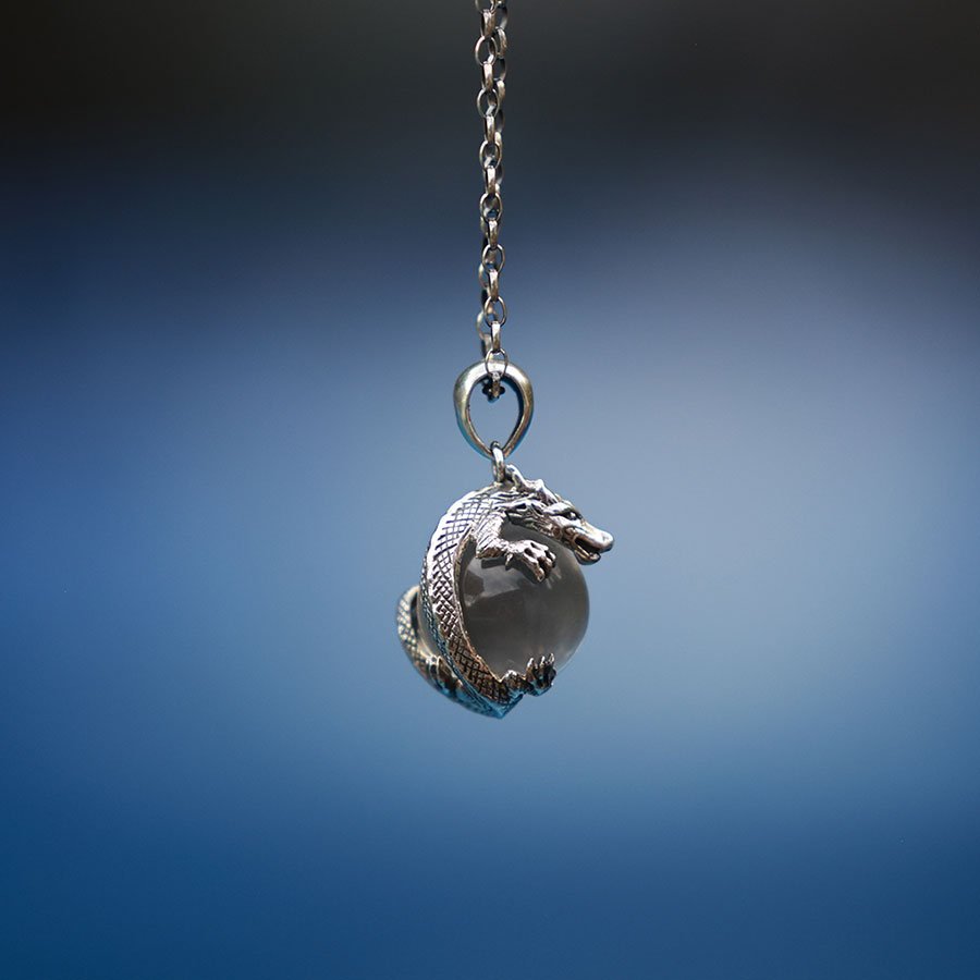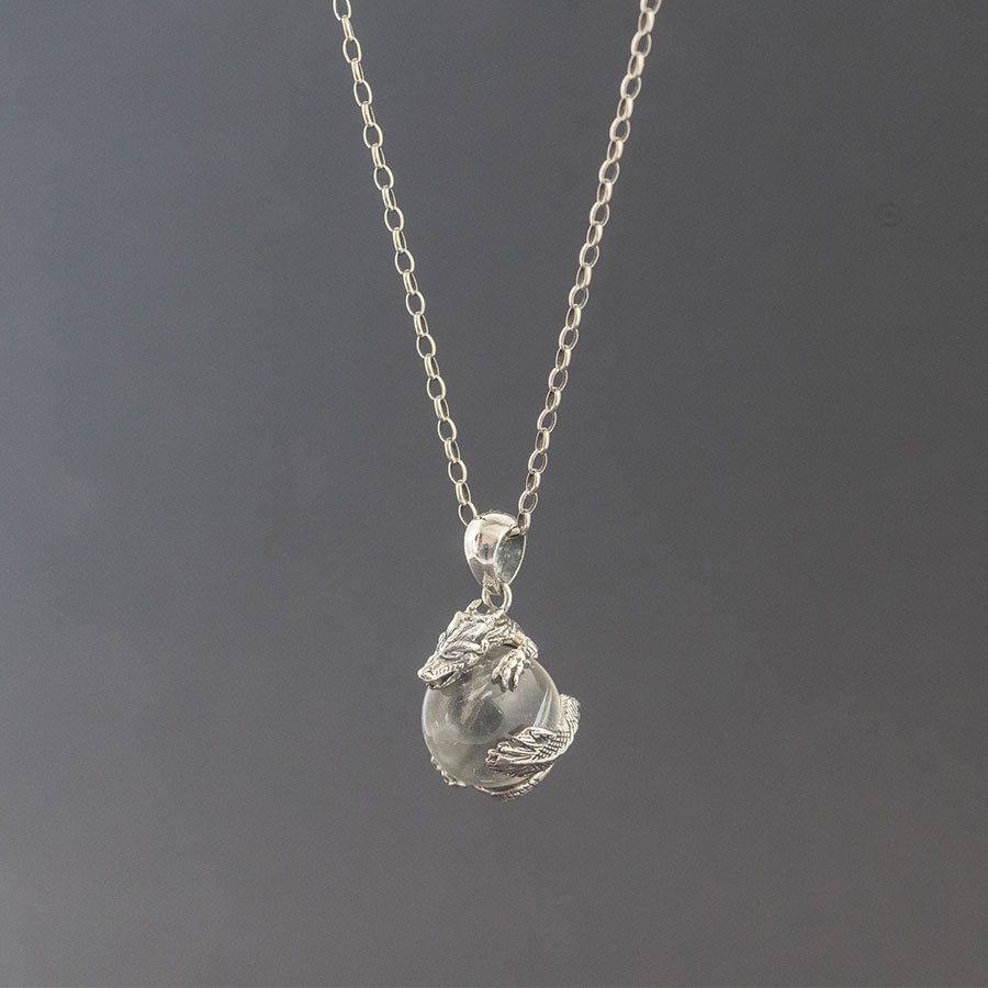 Naszyjnik dla wielbicieli smoków. Kryształ górski (16 mm) w szponach pradawnego smoka. Całość wykonana ręcznie ze srebra próby 925. Długość wisiorka 3,4 cm.