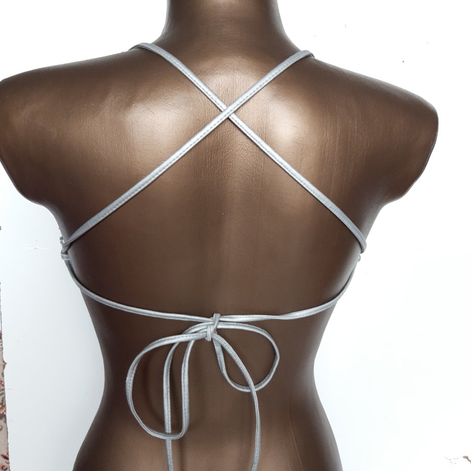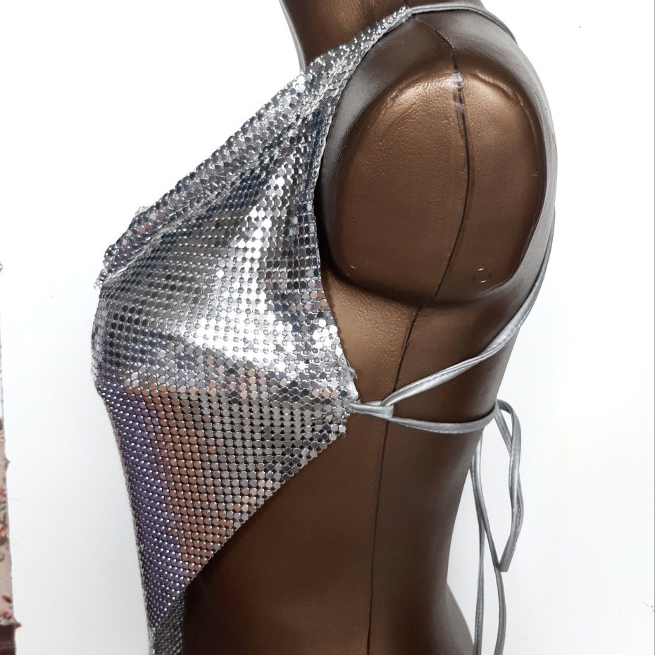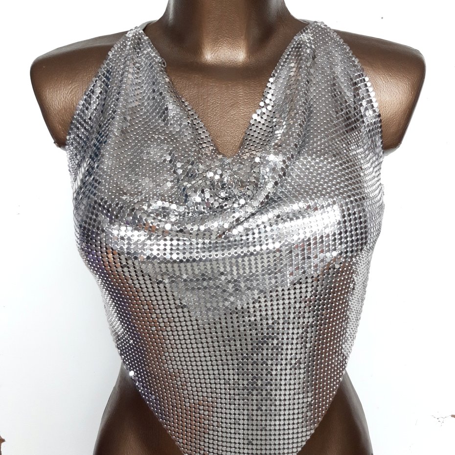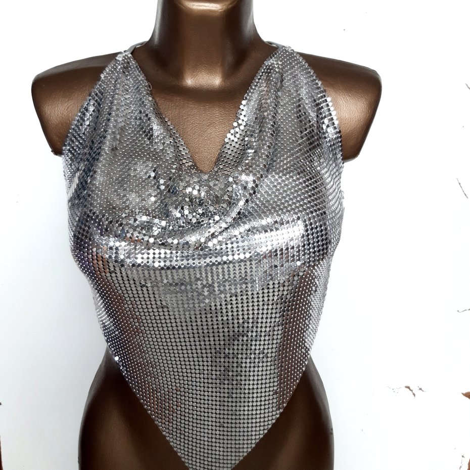 Srebrny top uszyty z takiej cienkiej jakby metalowej siateczki.