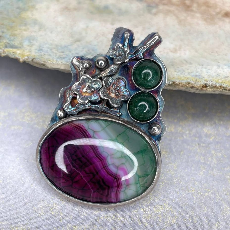 Srebrny wisior z agatem i awenturynami to kompozycja inspirowana naturą i kolorem, która przyciąga uwagę od pierwszego spojrzenia. Centralne miejsce zajmuje owalny agat otoczony kwiatami. Jego urok został podkreślony dwoma awenturynami, które wnoszą lekkość i delikatny blask. Ozdobna oprawa z oksydowanego srebra, wzbogacona florystycznymi motywami, dopełnia całości, nadając jej artystyczny i elegancki charakter.