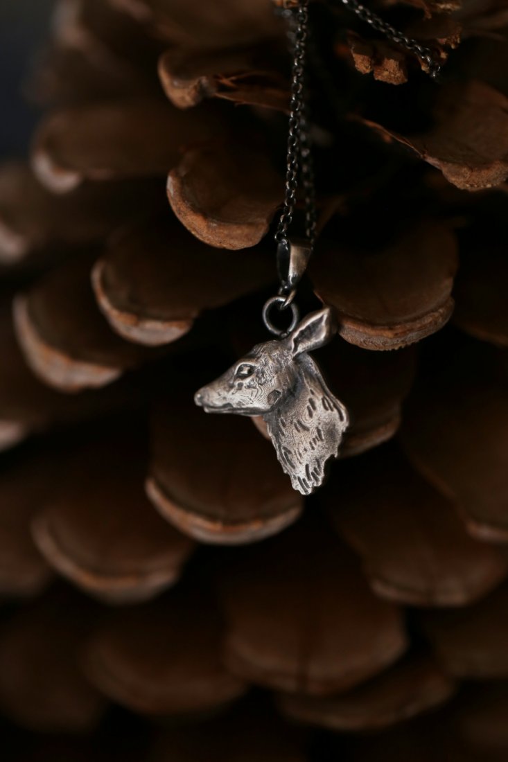 Srebrny wisior ukazujący łanię, samicę jelenia szlachetnego.
