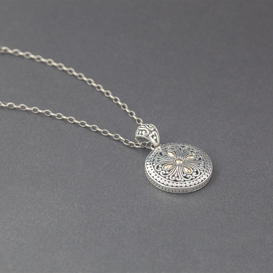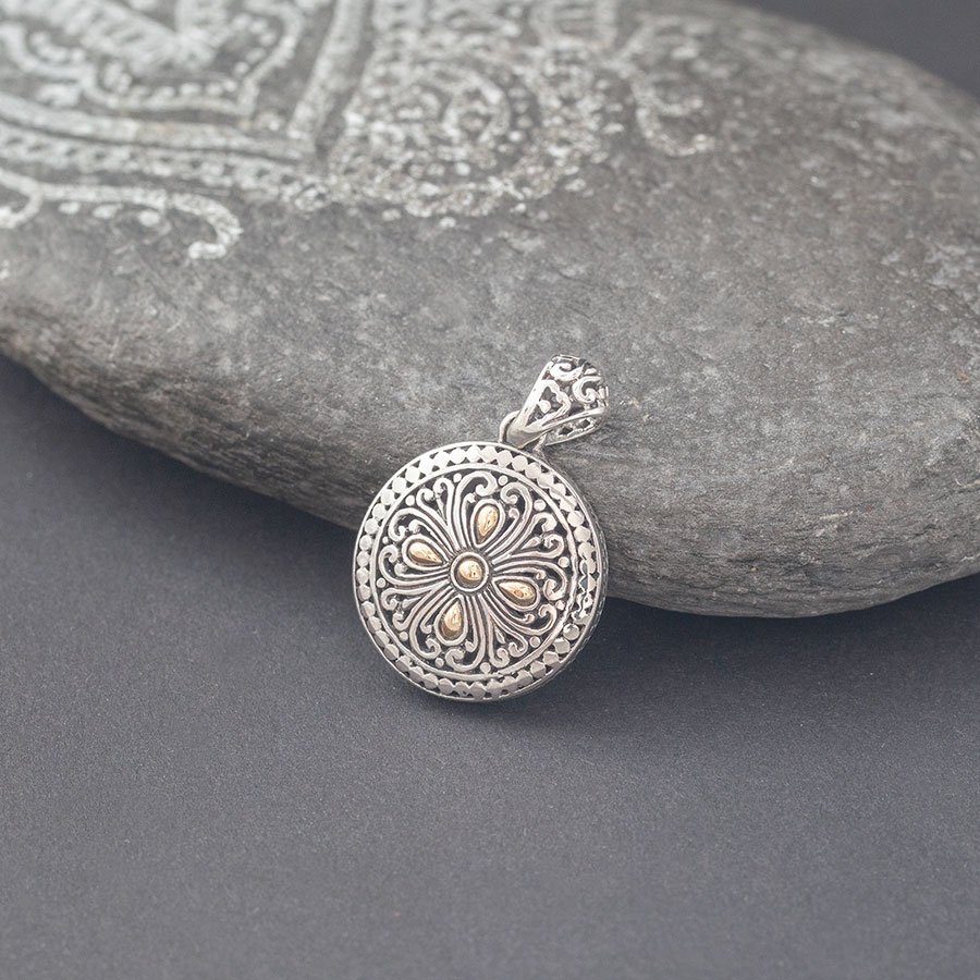 Wisiorek od podstaw wykonany ręcznie ze srebra próby 925 oraz 18-karatowego złota. Wielkość tarczy wisiorka 24 mm. Długość całkowita wisiorka 3,7 cm.