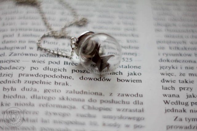Delikatny, maleńki, papierowy żuraw - japoński symbol szczęścia, zdrowia i pokoju. Podobno, jeśli w jakiejś intencji złoży się tysiąc żurawich figurek, to życzenie się spełni. My spełniamy życzenia tym zjawiskowym wisiorkiem. Papierowy żuraw ukryty w szklanej kuleczce o najszerszej średnicy 2 cm. Część ozdobna zawieszona na łańcuszku o długości 35 cm. Całość w kolorze srebra.
