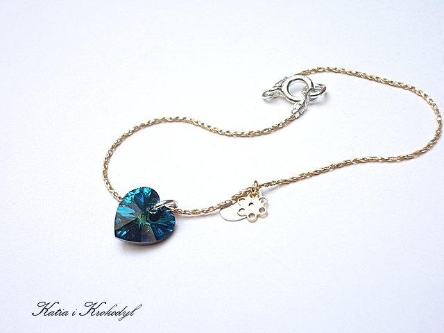 Delikatna bransoletka wykonana w całości ze srebra i srebra pokrytego 24k złotem [pr. 925]. Łańcuszek splatany w żmijkę w kolorze złota i srebra.Zawieszka kryształek Swarovskiego heart [10mm bermuda blue] Całkowita długość bransoletki około 18cm.Biżuteria ozdobnie zapakowana.