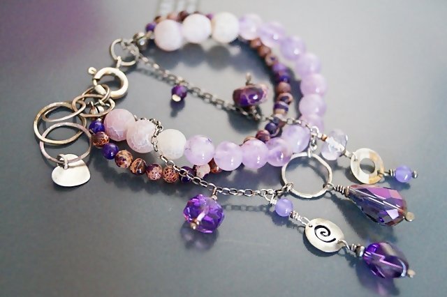 Bransoletka wykonana ze srebra oksydowanego próby 925 , jaspisów cesarskich , fasetowanych ametystów, ametrynów, naturalnych ametystów lawendowych klasy A, kryształowej kropli, elementów srebrnych w tym serduszka.Wykończona masywnym łańcuszkiem wykonanym ręcznie.Wielkość kamieni do ok. 4- 16 mm..