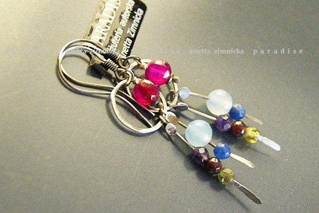 Kolczyki wykonane ze srebra oksydowanego próby 925, agatów fuksja, granatów,ametystów,granatów grossularów,kwarców, kutych obręczy.Wielkość minerałów od 4 do 6 mm.