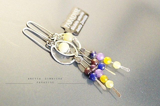 Subtelne kolczyki wykonane ze srebra oksydowanego próby 925,kwarców,fasetowanych opali,jaspisów cesarskich, granatów, kutych nieregularnych obręczy śr. 16 mm.Wielkość minerałów do 5 mm.