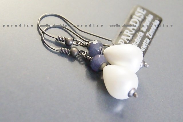 Kolczyki wykonane ze srebra oksydowanego próby 925, kropli pękatych pereł, fasetowanych iolitów Wielkość kamieni do 14 mm.