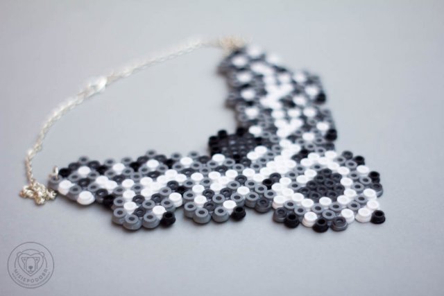 Niezwykła kolia z ponadczasowym połączeniem srebrzystej czerni z bielą. Dodatkowo wzbogacona efektem perłowego blasku. Nowoczesna forma, z jednej strony przypominająca piksele, z drugiej klocki lego, czyni ją jeszcze bardziej niepowtarzalną. Kolia wykonana z plastikowych koralików. Długość z łańcuszkiem 27 cm. Łańcuszek z zapięciem w kolorze srebra.