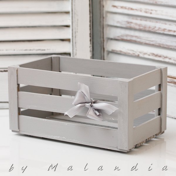 Drewniana skrzynka z listewek, malowana ręcznie. Sprawdzi się jako dekoracja na półce, stole, nadaje się też na skrzynkę, w której podamy np owoce.