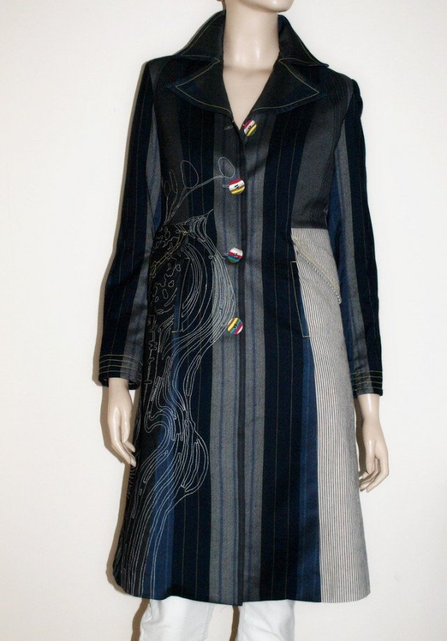 unikatowy płaszczyk duńskiej marki st. martins, Taliowany, połączenie różnych materiałów, aplikacji. podwójne kieszenie, do wewnątrz i nakładane. slicznie wykończony od wewnatrz (także z kieszeniami). Stan bardzo dobry. Materiał 24% wiskoza, 21% bawełna 44% poliester 3% spandex 8%len. Rozmiar z metki S. Prezentowany na manekinie o rozmiarze 38 (małe).