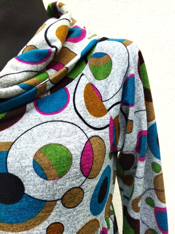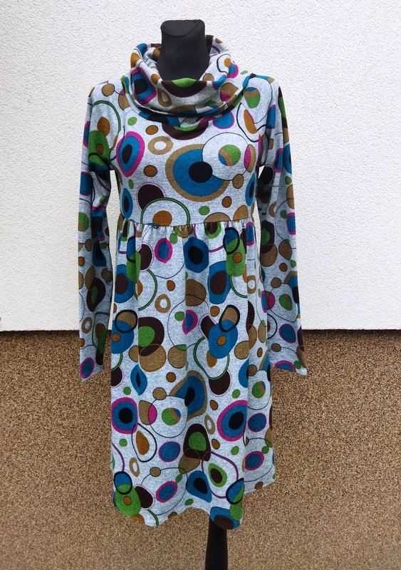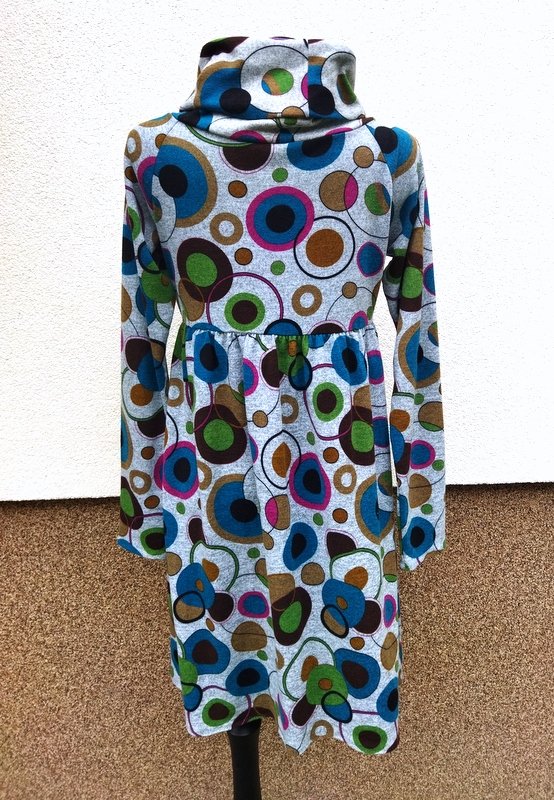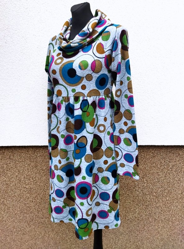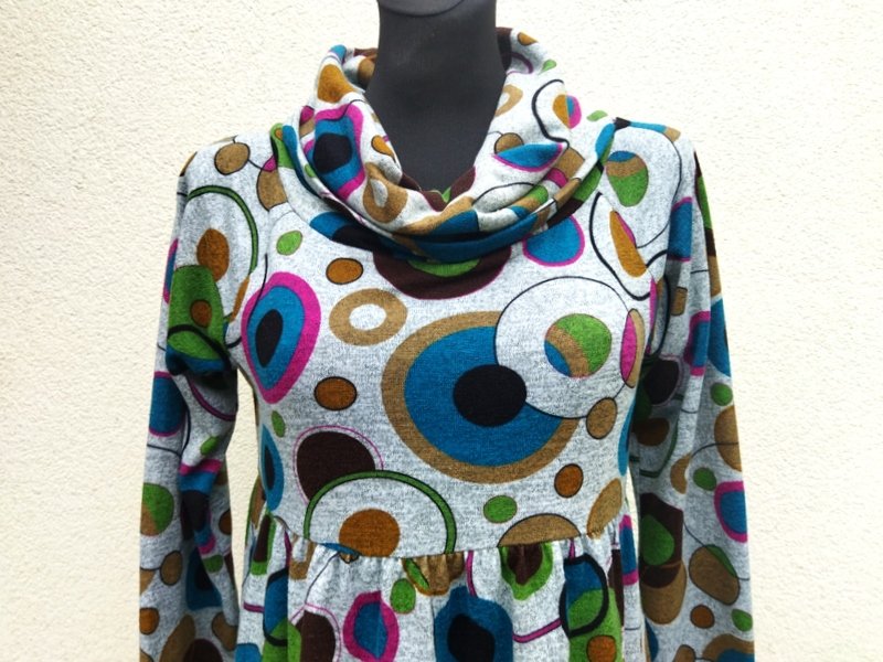 Sukienka z miłej wzorzystej tkaniny dzianinowej z wzorami w kolorach morskiej i groszkowej zieleni, ciemnego i tabaczkowego brązu, fuksji i czerni na melanżowym jasnoszarym tle. Z luźnym golem, z raglanowymi rękawami , powyżej pasa wszyta gumka, dół marszczony. miła , podatna i rozciągliwa