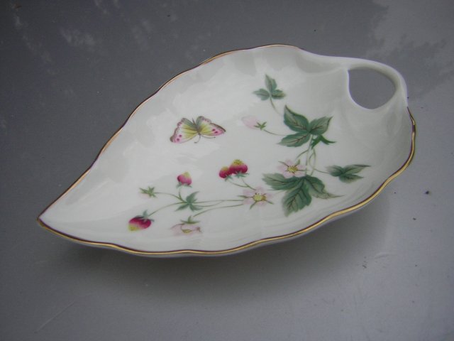 Porcelanowa patera, sygnowana ST. MICHAEL ASHBOURNE ENGLISH BONE CHINA MADE IN U. K. 2605. Szlachetna porcelana wykwintne zdobienie. Liść z dziurką -uchwytem, wyraźnie zaznaczone ryflowana - żyłki liścia. Zdobienie smakowite. ..poziomkowe kwiaty, owoce, liście. ..i ... Uroczy motylek. Wykończenie błyszczące, rant złocony