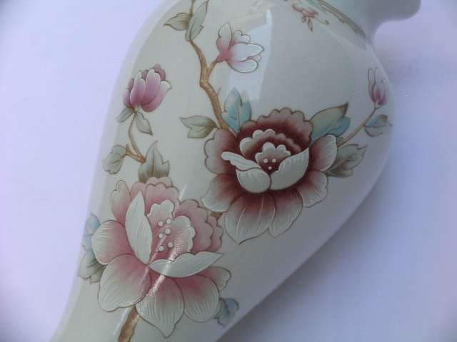 Elegancki porcelanowy wazon w klasycznie kwiatowej odsłonie. Kobiecy, dekoracyjny. Złocenia rantów i delikatnie błyszczące wykończenie. Sygnowany St. Michael, seria Claremont. Dół 5,5; pękatość 7,5; wysokość 15 cm. Stan zachowania bardzo dobry.