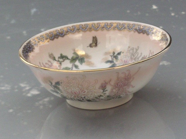 Porcelanowa misa w wyjątkowo eleganckim i bogato dekorowanym wydaniu i orientalnej stylistyce. Ciekawe, bardzo kobiece spotkanie łososiowo-pudrowego różu ze złotem i precyzją barwnej, rajsko-ogrodowej malatury. Porcelana solidna, przyjemna w dotyku. Błyszcząco-satynowe szkliwienie i lekka fakturowość precyzyjnego wzoru. Ciekawe wypustki w formie, po zewnętrznej stronie pod rantem, jakby miała być włożona w rodzaj obejmy lub stelaża... Dół 6,5; góra 15,5 wys.6 cm. Stan zachowania bardzo dobry. Elegancją doskonale ozdobi np. kąpielowy salon, buduar...