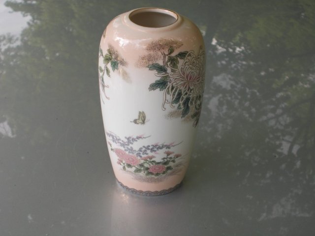 Porcelanowy wazon w wyjątkowo eleganckim i bogato dekorowanym wydaniu i orientalnej stylistyce. Ciekawe, bardzo kobiece spotkanie łososiowo-pudrowego różu ze złotem i precyzją barwnej, rajsko-ogrodowej malatury. Porcelana solidna, przyjemna w dotyku. Błyszcząco-satynowe szkliwienie i lekka fakturowość precyzyjnego wzoru. Edycja numerowana z maja 1989 roku. Dół 5 x 4 pękatość 7,5 x 6; wys. 14cm. Stan zachowania bardzo dobry. Elegancją doskonale ozdobi np. kąpielowy salon, buduar...