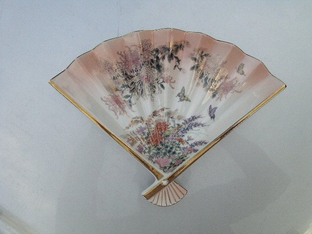 Duża porcelanowa patera wachlarzowa w wyjątkowo eleganckim i bogato dekorowanym wydaniu i orientalnej stylistyce. Ciekawe, bardzo kobiece spotkanie łososiowo-pudrowego różu ze złotem i precyzją barwnej, rajsko-ogrodowej malatury. Porcelana solidna, przyjemna w dotyku. Lekka fakturowość wzoru, wachlarzowe ryflowanie i błyszczące szkliwienie. 28 x 22 x 3 cm. Stan zachowania bardzo dobry minus .