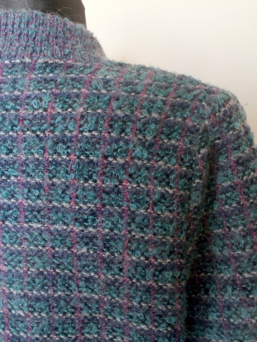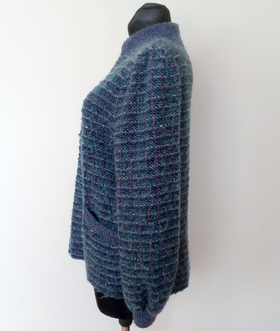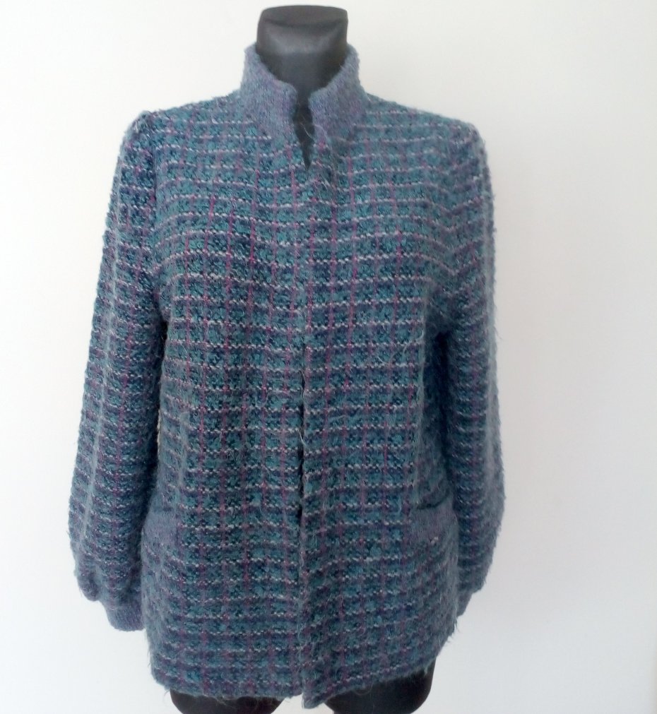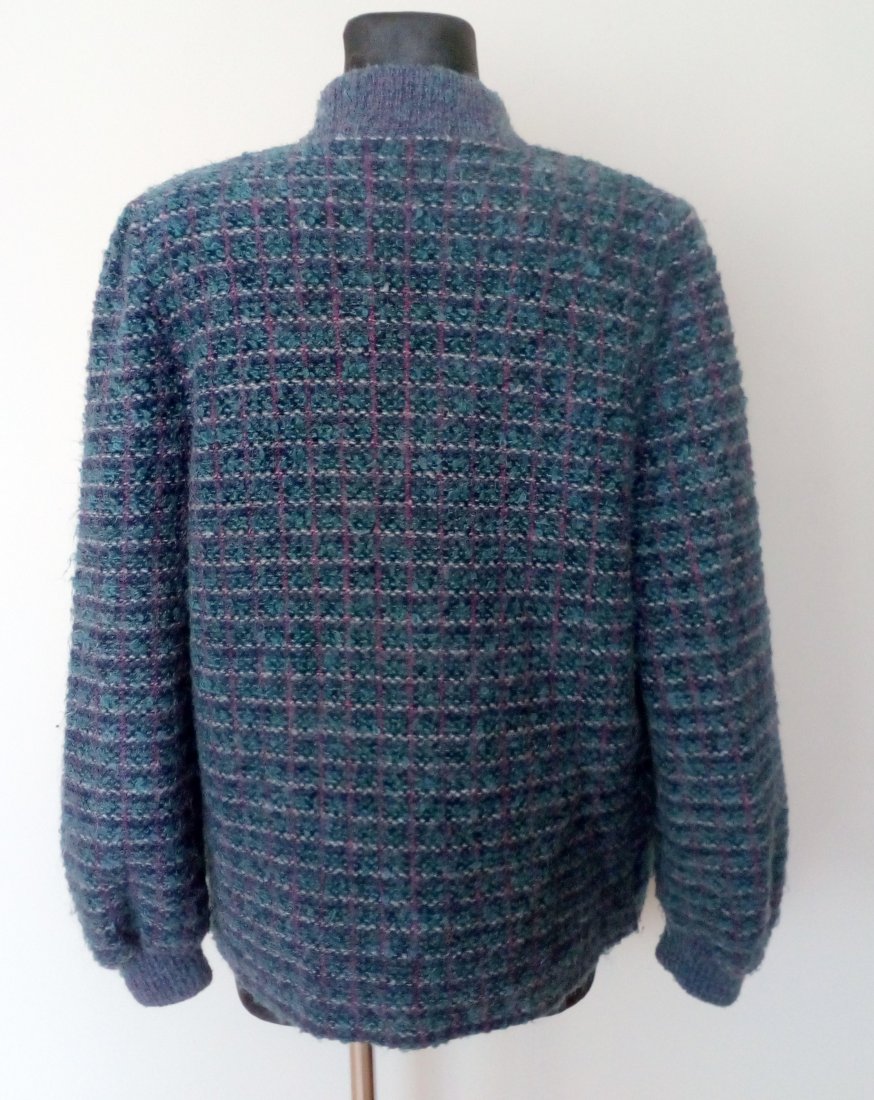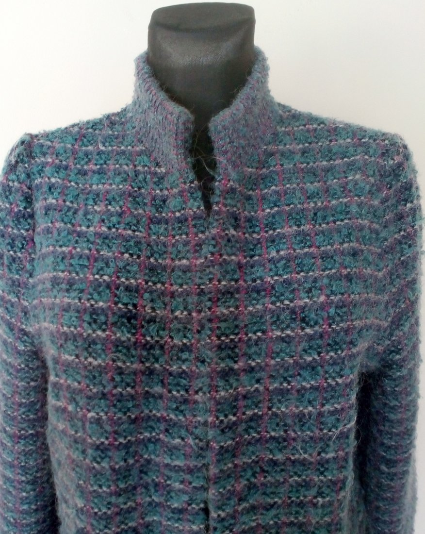 Dzianinowy żakiet/ sweter typu boucle, kolor melanżowy - morska zieleń, zgniła zieleń, biel, bordowy, wokół szyi stójka, fason bez zapięcia, u dołu przodu wpuszczane kieszenie, rękaw ze ściągaczem, całość bez podszewki